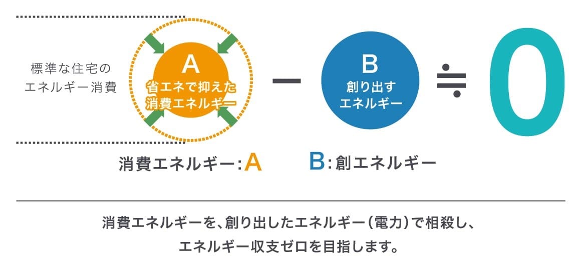 断熱性機能を高めたり温水式床暖房などの省エネルギー設備を導入したりすることで、家全体の消費エネルギーを大幅に減らすのに加えて、太陽光発電や燃料電池などで必要なエネルギーを創り出すことで、年間エネルギーの収支ゼロを目指します。