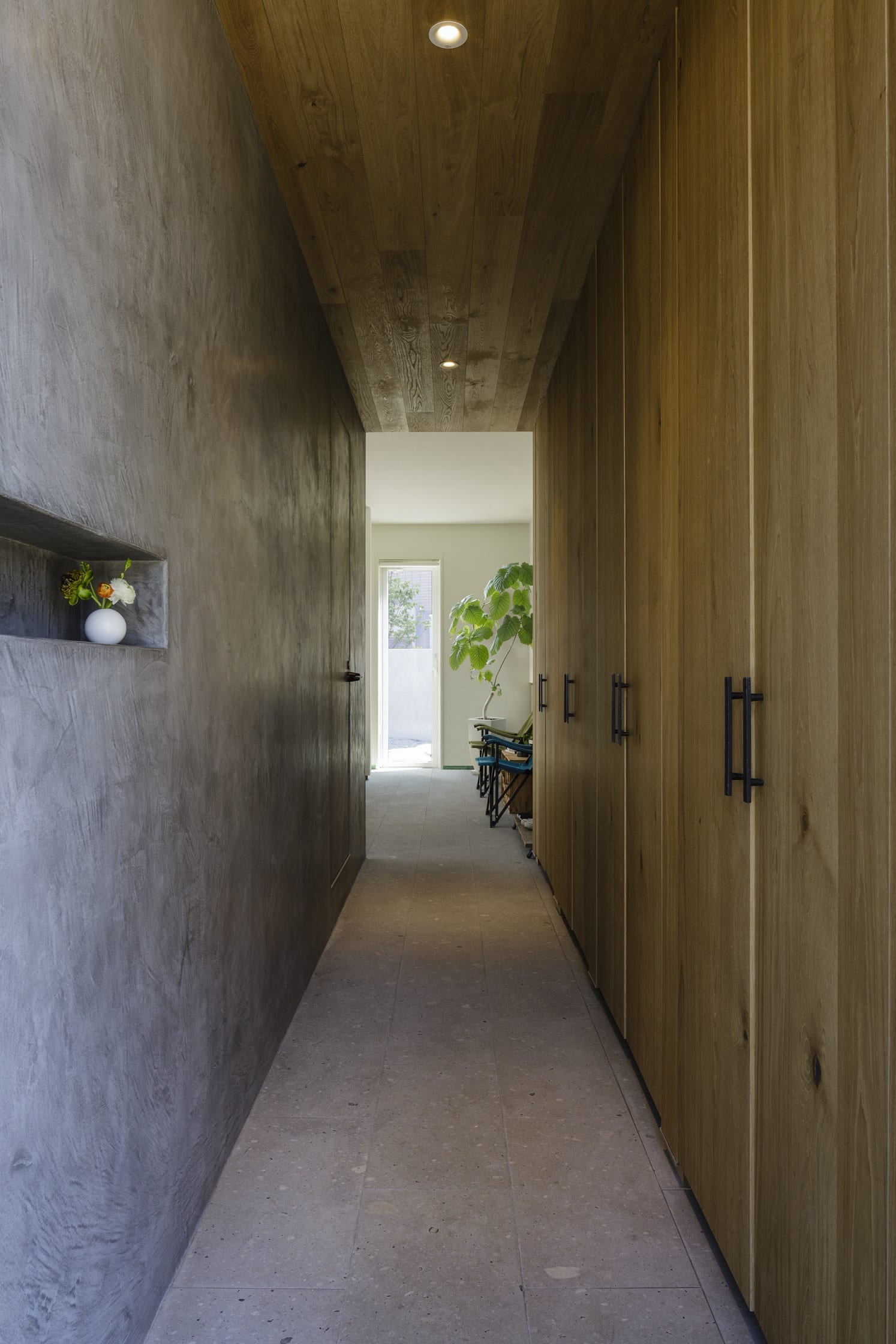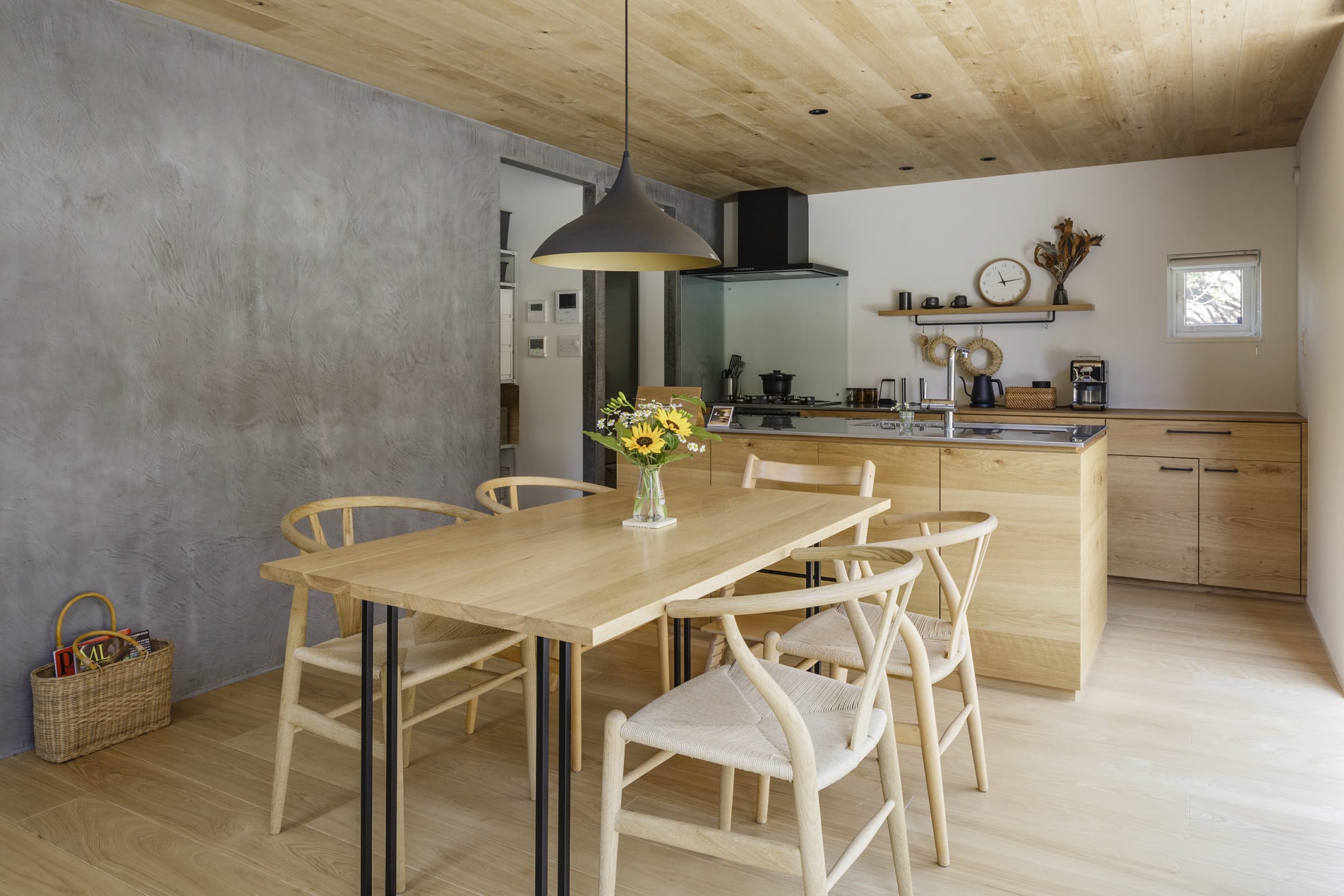 ナラ無垢材のキッチンやダイニングテーブルが、独特の素材感を持つグレーの塗り壁とマッチ