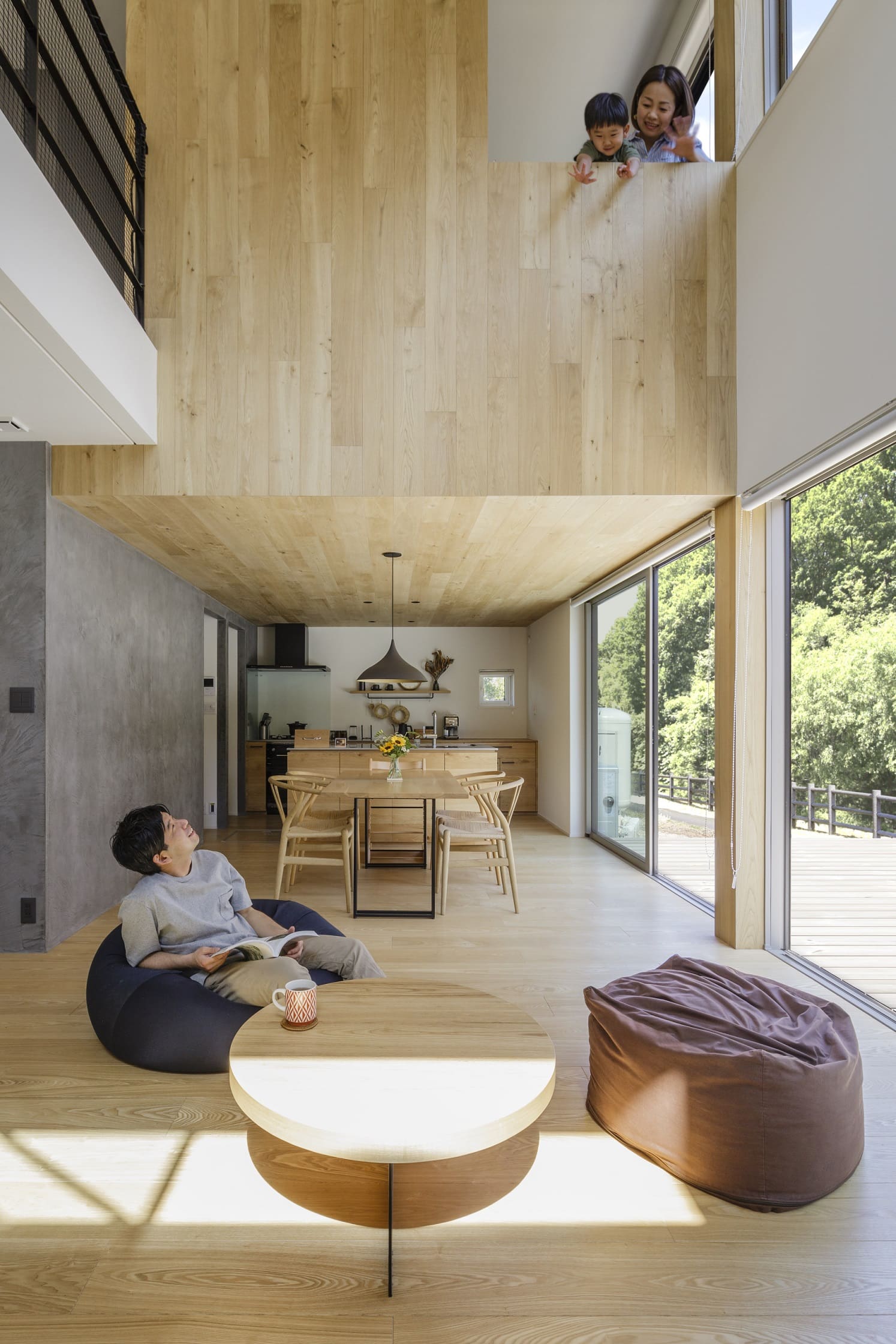 リビングの北東側は、大きなガラス戸にし、部屋のどこにいても四季折々に変化する景色を楽しむことができるように設計しました。1、2階は吹き抜けになっており、縦横に広がる窓と相まって、解放感は抜群です。さらに2階には子ども部屋と寝室があり、寝室の吹き抜けに面する壁を四角く、くり抜きました。その理由について、夫・Rは…。