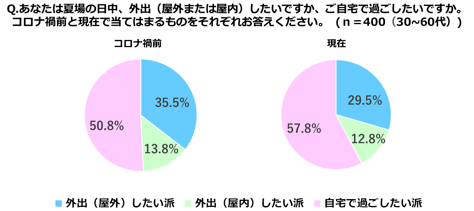 積水ハウスの研究機関である住生活研究所は、「住まいにおける夏の快適性に関する調査(2022年)」を実施し、20~60代の500人を対象に、夏場の日中の過ごし方について聞きました。結果、30~60代の方においては、「自宅で過ごしたい」 と答えた人が57.8%と最も多く、「外出したい」を上回りました。実は、コロナ禍前から「自宅で過ごしたい」と答えた人は50.8%と、すでに半数いましたが、外出自粛ムードが緩和された現在においても、自宅で過ごしたい派は増えているようです。