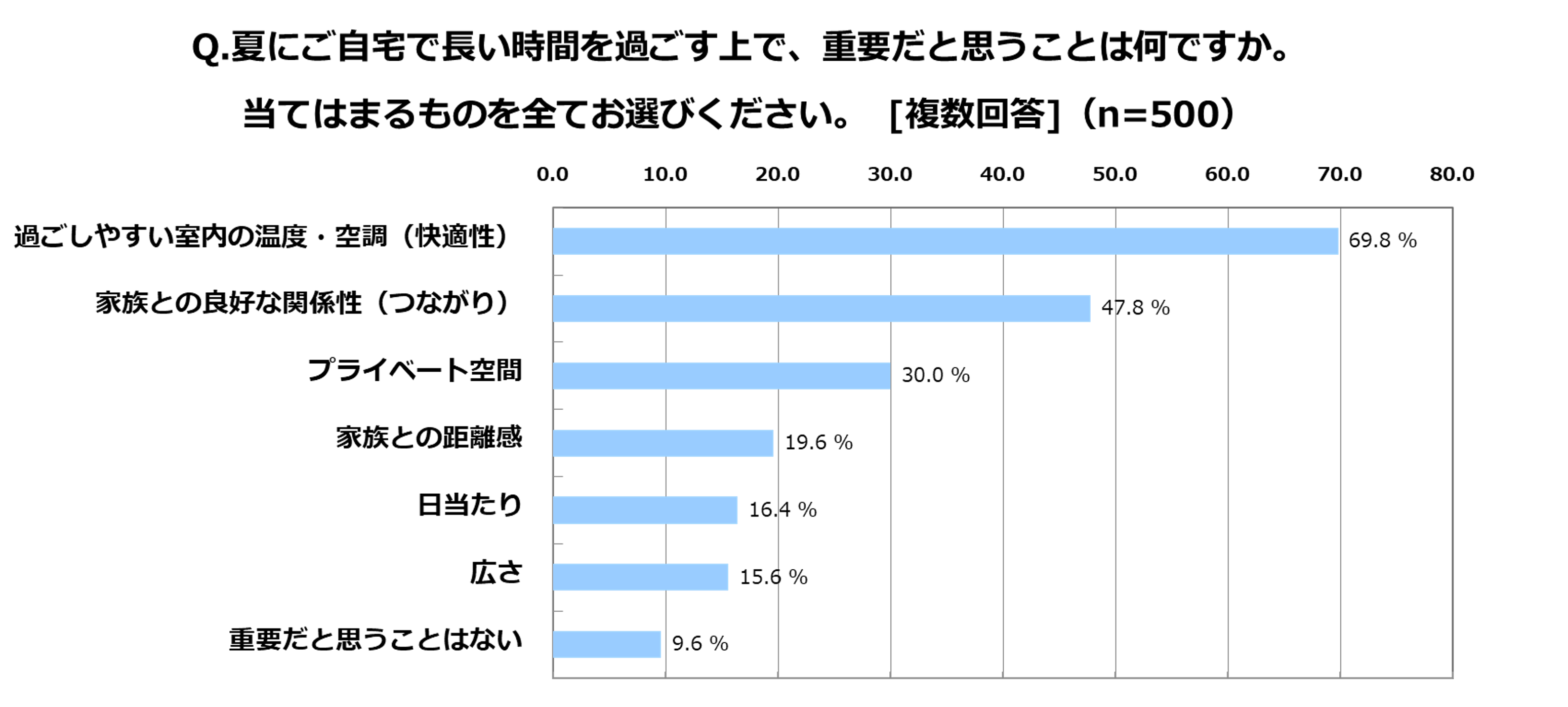 さらに、「夏にご自宅で長い時間過ごす上で、重要だと思うことは何ですか」の質問では、「過ごしやすい室内の温度・空調(快適性)」と回答した人が最も多かったものの、「家族との良好な関係性(つながり)」を挙げた人が47.8%にも上りました。また、「プライベート空間」や「家族との距離感」を重要視している人も比較的多くみられました。