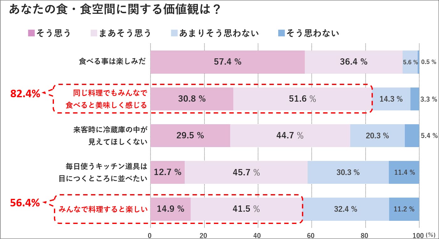 コロナ禍をきっかけに在宅ワークが広まってから、「家族で一緒に食事をとる機会が増えた」という声をよく聞きます。積水ハウスがコロナ禍に行った食・食空間に関するアンケートでは、「同じ料理でもみんなで食べると美味しく感じる」「みんなで料理すると楽しい」がクローズアップされ、食を通じて家族のつながりや楽しさを実感している人が多く見られました。