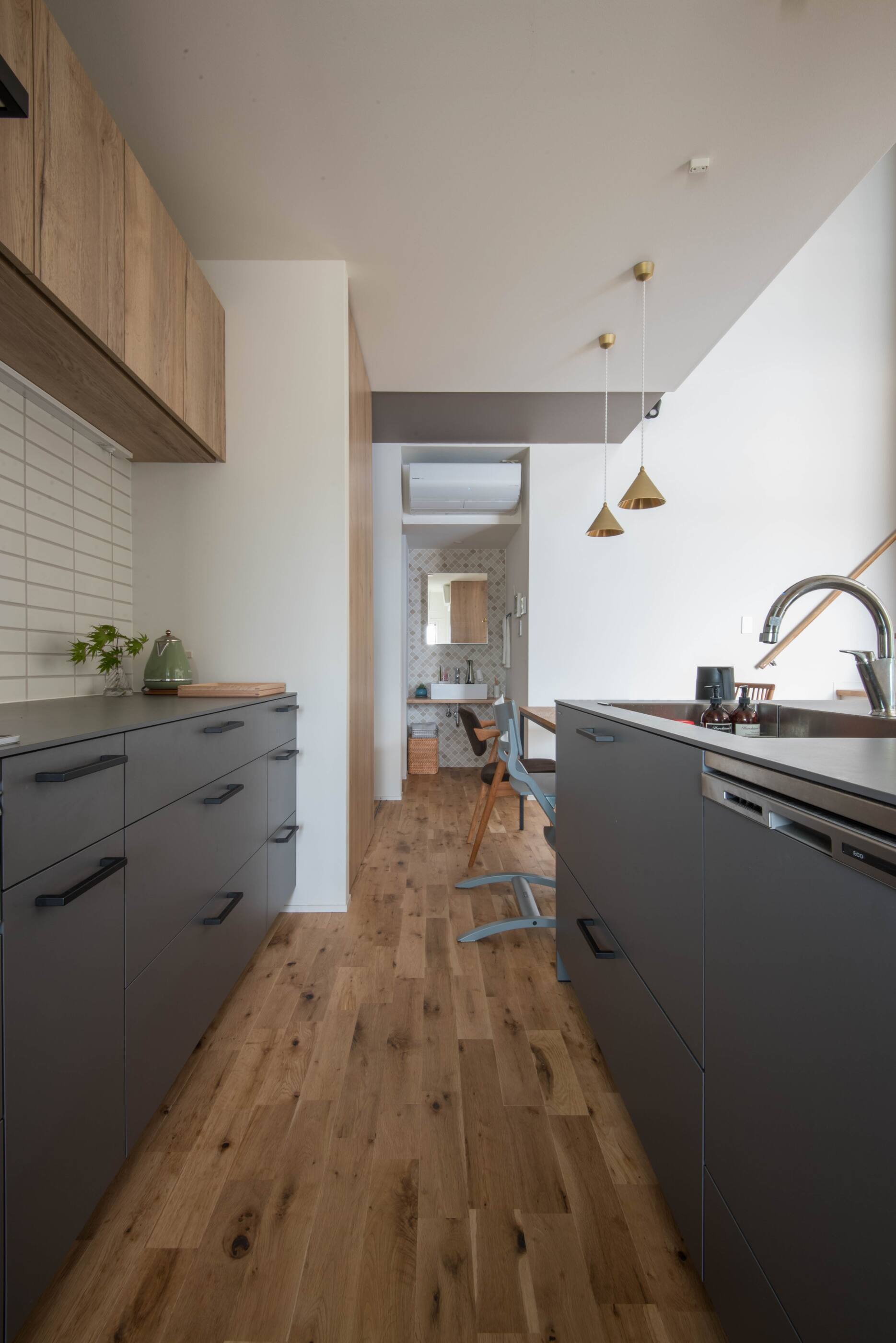 キッチンの奥に脱衣所と浴室を配置した一直線の家事動線。キッチンとの間はオークの引き戸で仕切りも