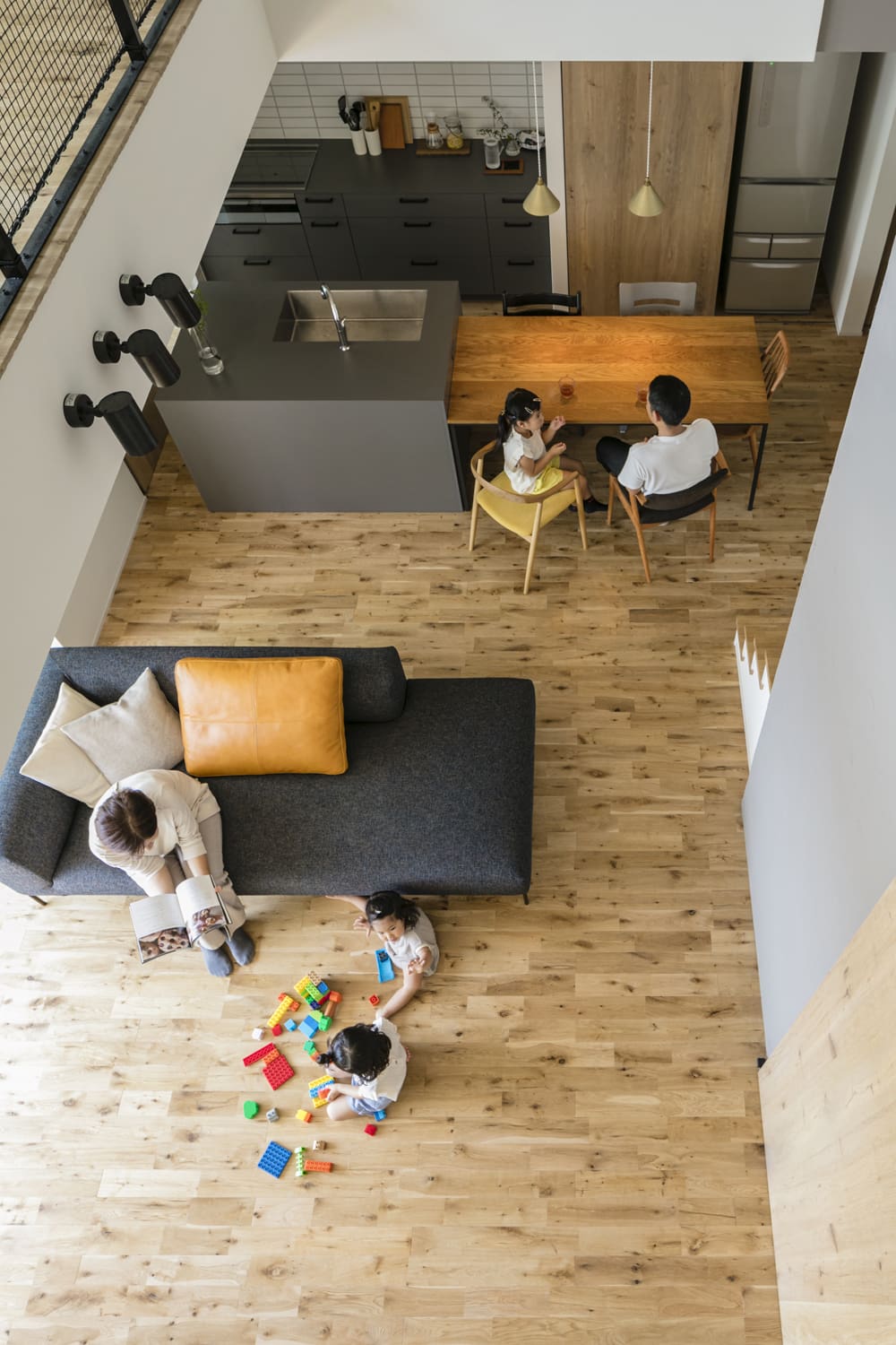 キッチン・ダイニングとつながったリビング空間は、夫・Kさんの要望で設置したウッドデッキとフラットにつながっており、上部の吹抜けとともに広い空間を演出しています。広いリビングをご希望だった夫・Kさんは、「やっぱりリビングかダイニングテーブルの周りにいることが多いですね。ソファは子どもたちと取り合いです(笑)」と満足しています。妻・Mさんも、お子さんたちが寝て、家事も一通り終わると、ご夫婦そろってリビングでゆっくりくつろいでいるそうです。