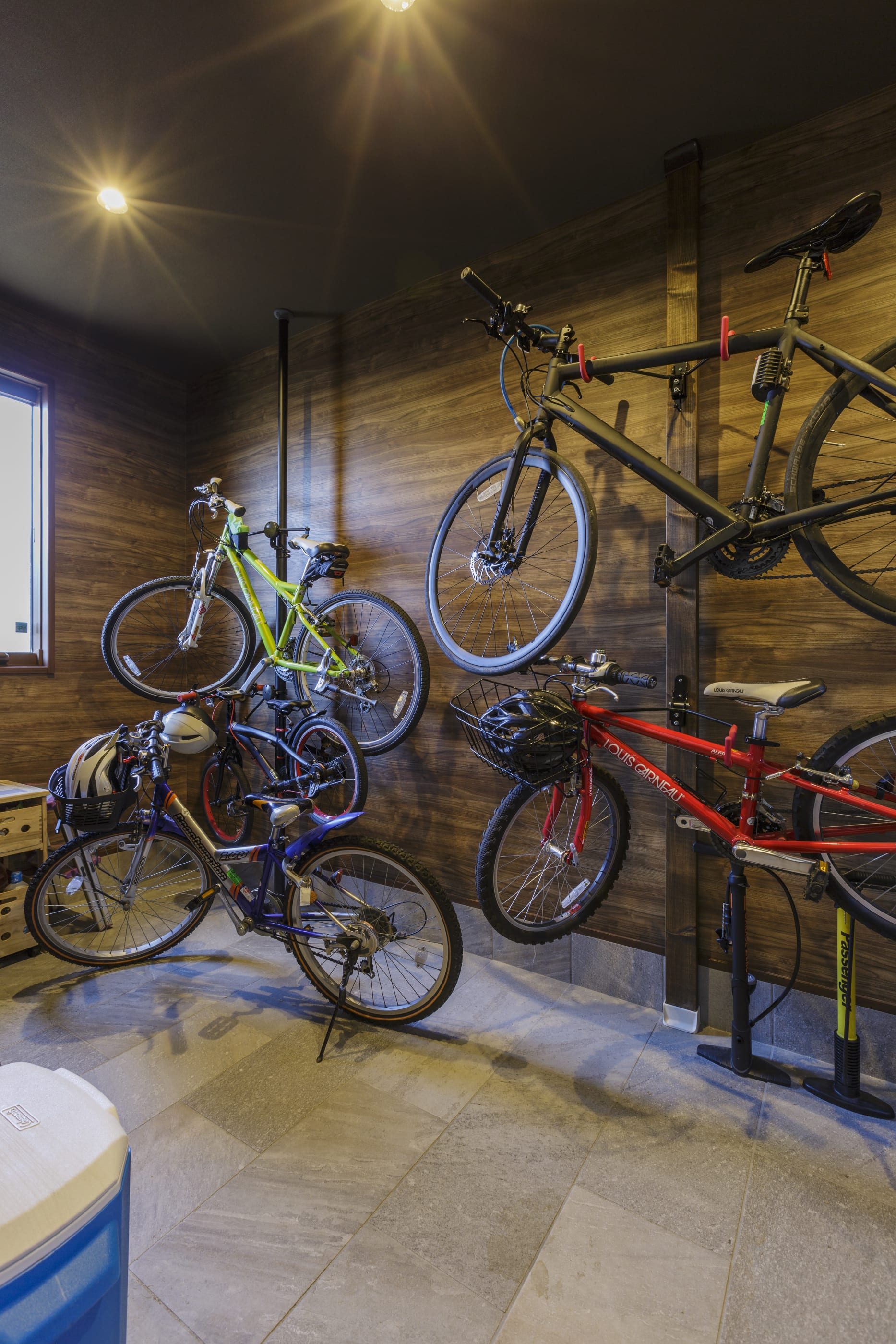 5人家族全員が自転車を持っているN様一家は、土間収納を内自転車置き場として利用しています。複数の自転車を壁に掛けることで、スペースもスッキリ。壁と天井には、妻・Y様のアイディアで木目調のクロスを貼っていて、自転車を壁掛けしても、汚れが目立ちにくく、拭きやすくなっています。