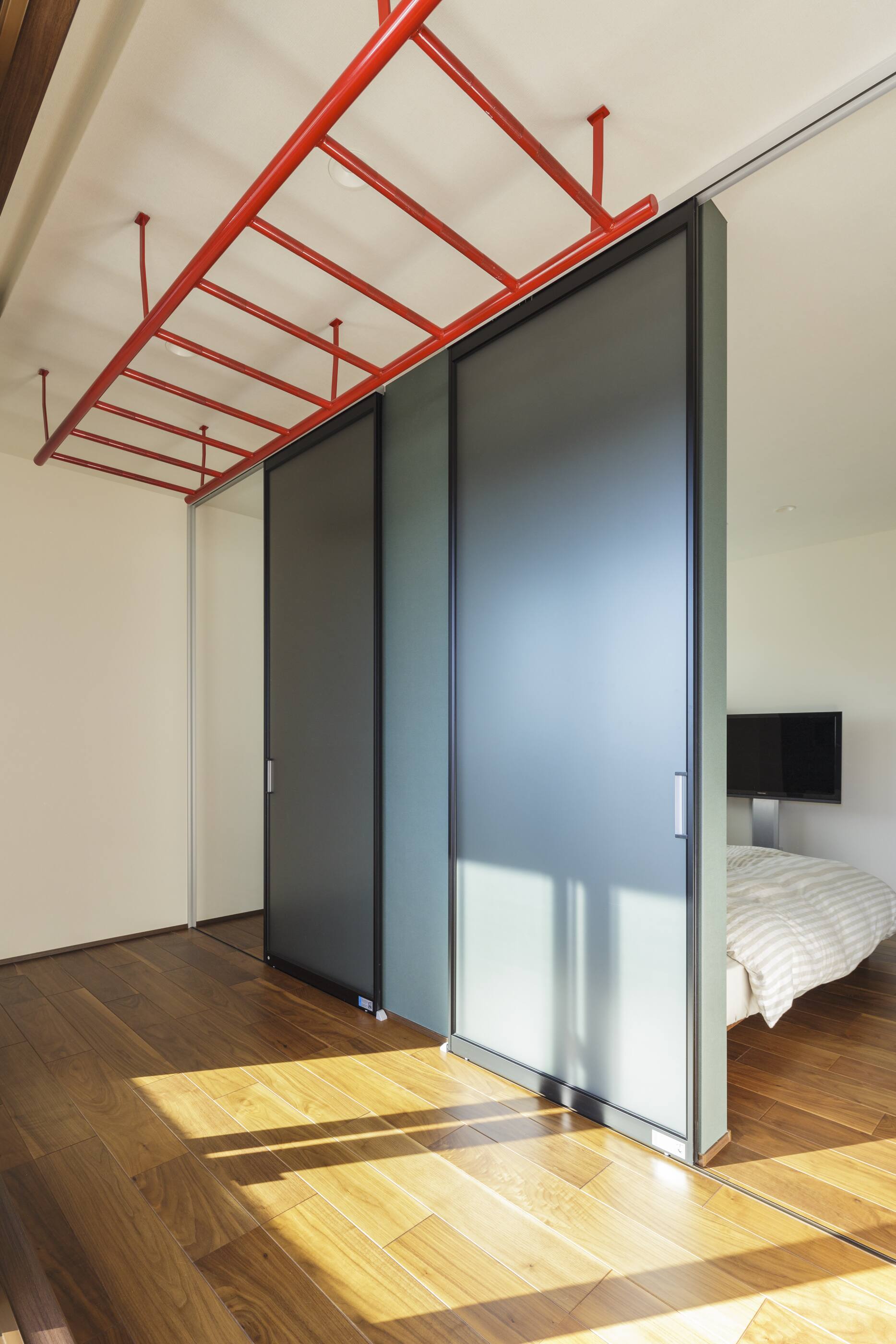 当初は子ども部屋につけることを考えていましたが、ごちゃごちゃして見えてしまうという懸念があり、綺麗に見せられるこの場所にしました。遊具としてだけでなく、室内干しのハンガー掛けも兼ねています。