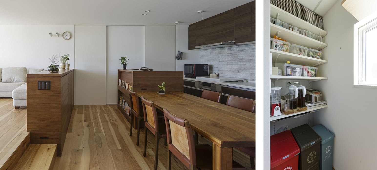 シンクとダイニングテーブルをひと続きにしたアイランドキッチン。パントリーのおかげですっきりした印象です