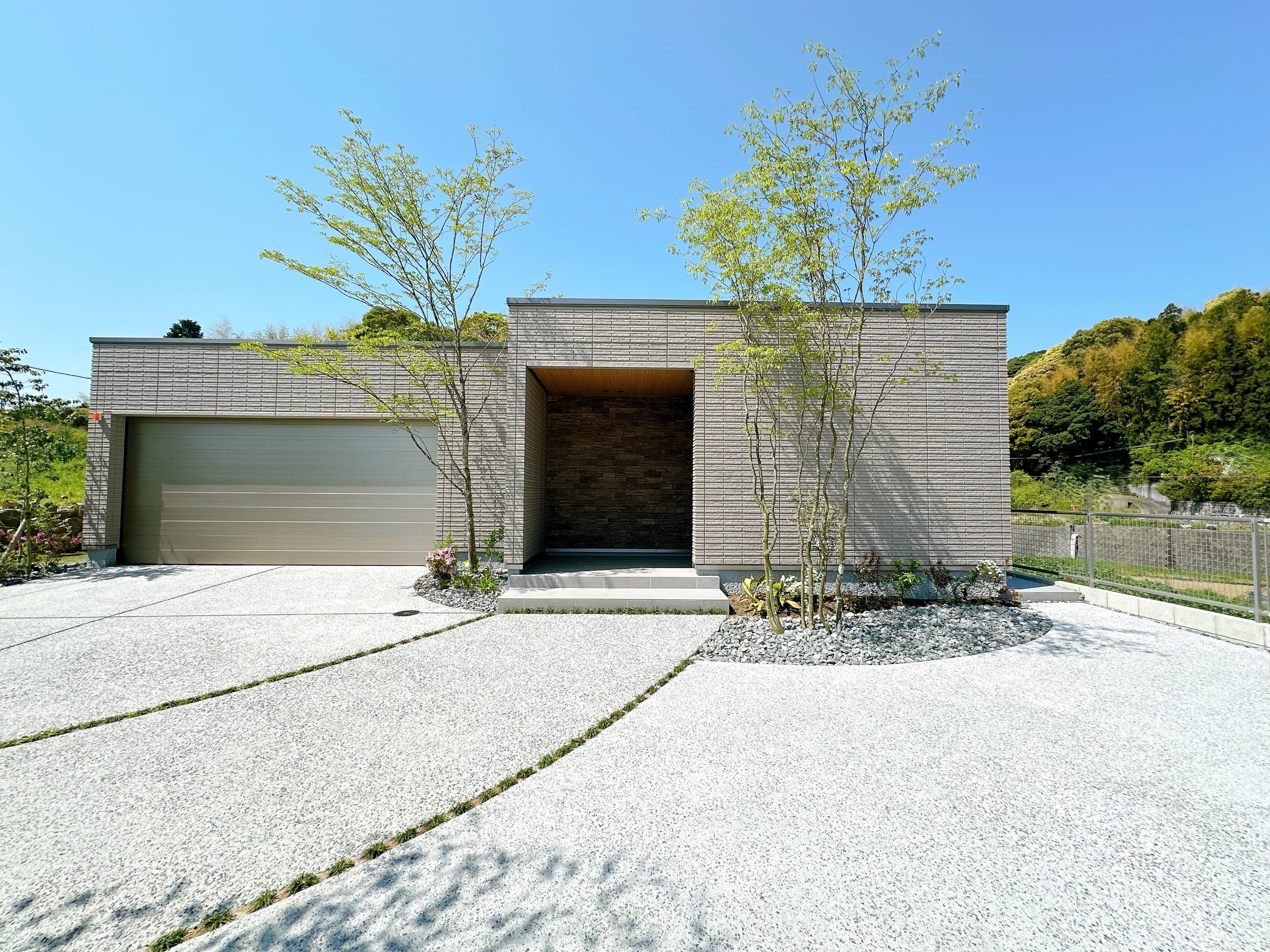 まず、建物は道路側、アプローチからも見えないように配置し、門扉はあえて設けず、敷地との境界が自然にわかるようにしました。全体的にしっとりとした旅館のような佇まいです。アプローチには、木を両側に植栽しトンネルのような空間をつくり、その奥に木製のゲートを設置。ゲートの上には緑が覆いかぶさるように植栽を施し、緑のトンネルをくぐって家に入るイメージです。まるで森の中に足を踏み入れるような感覚を、日常で味わっていただけるよう工夫しました。