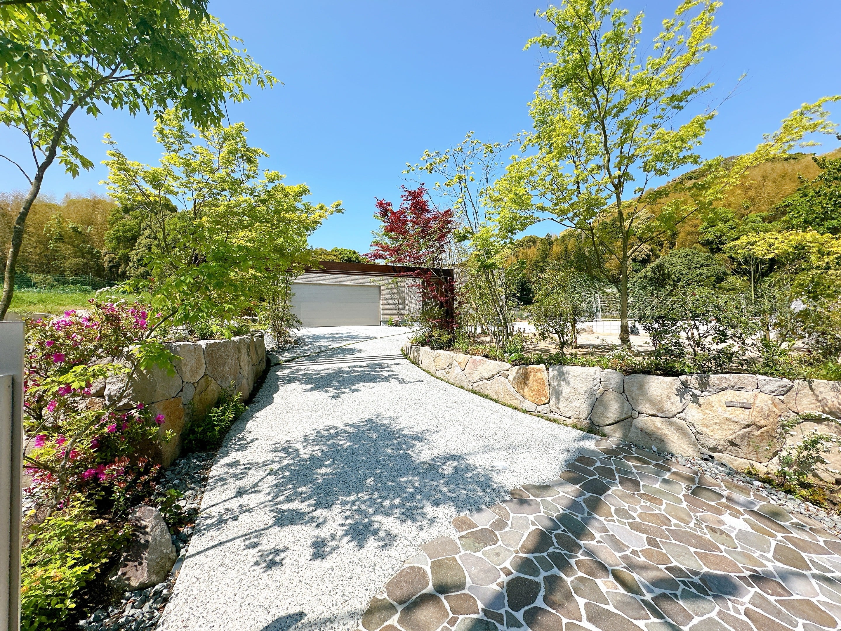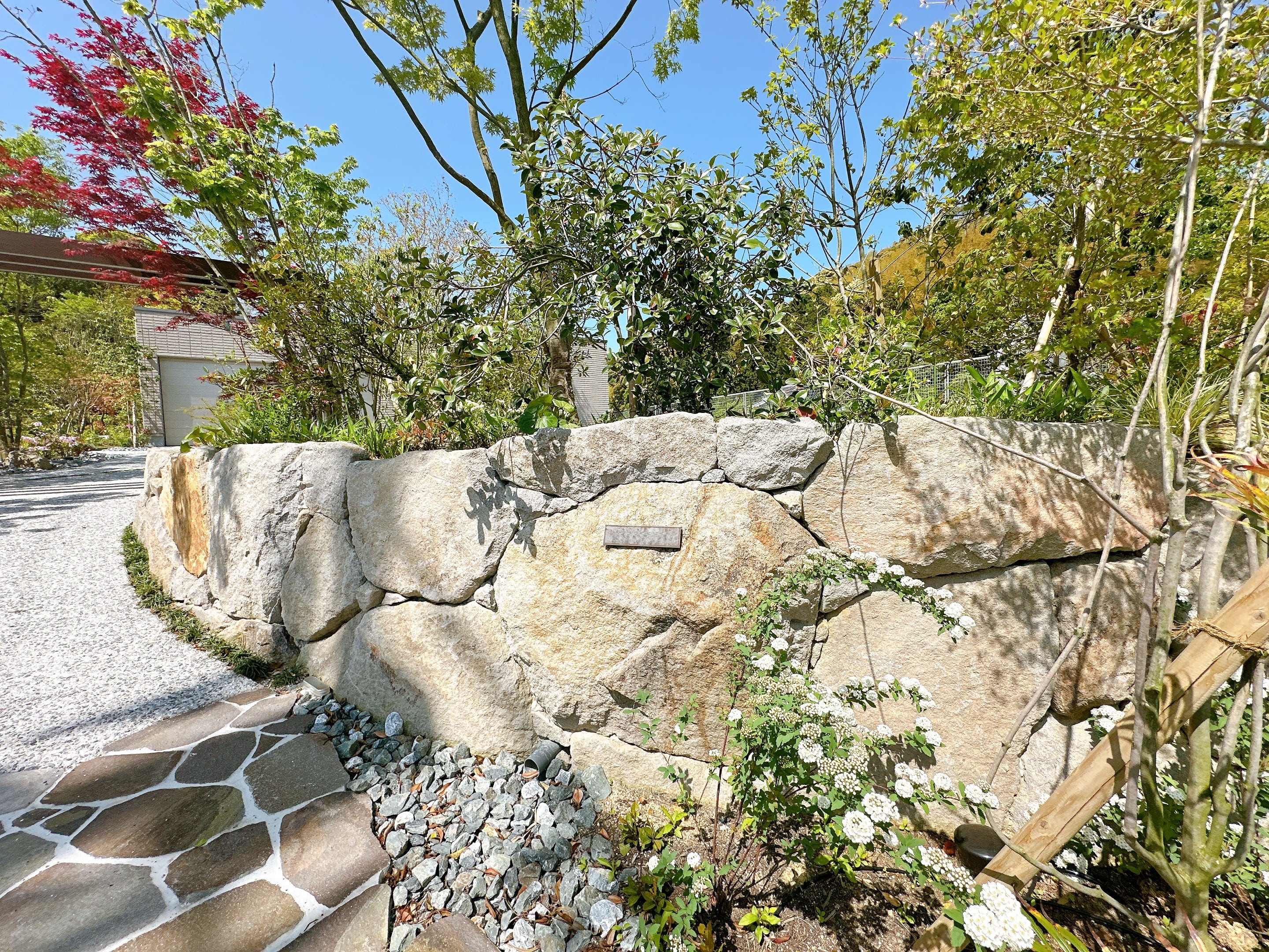 周囲の借景と調和する自然石を採用したアプローチの土留め