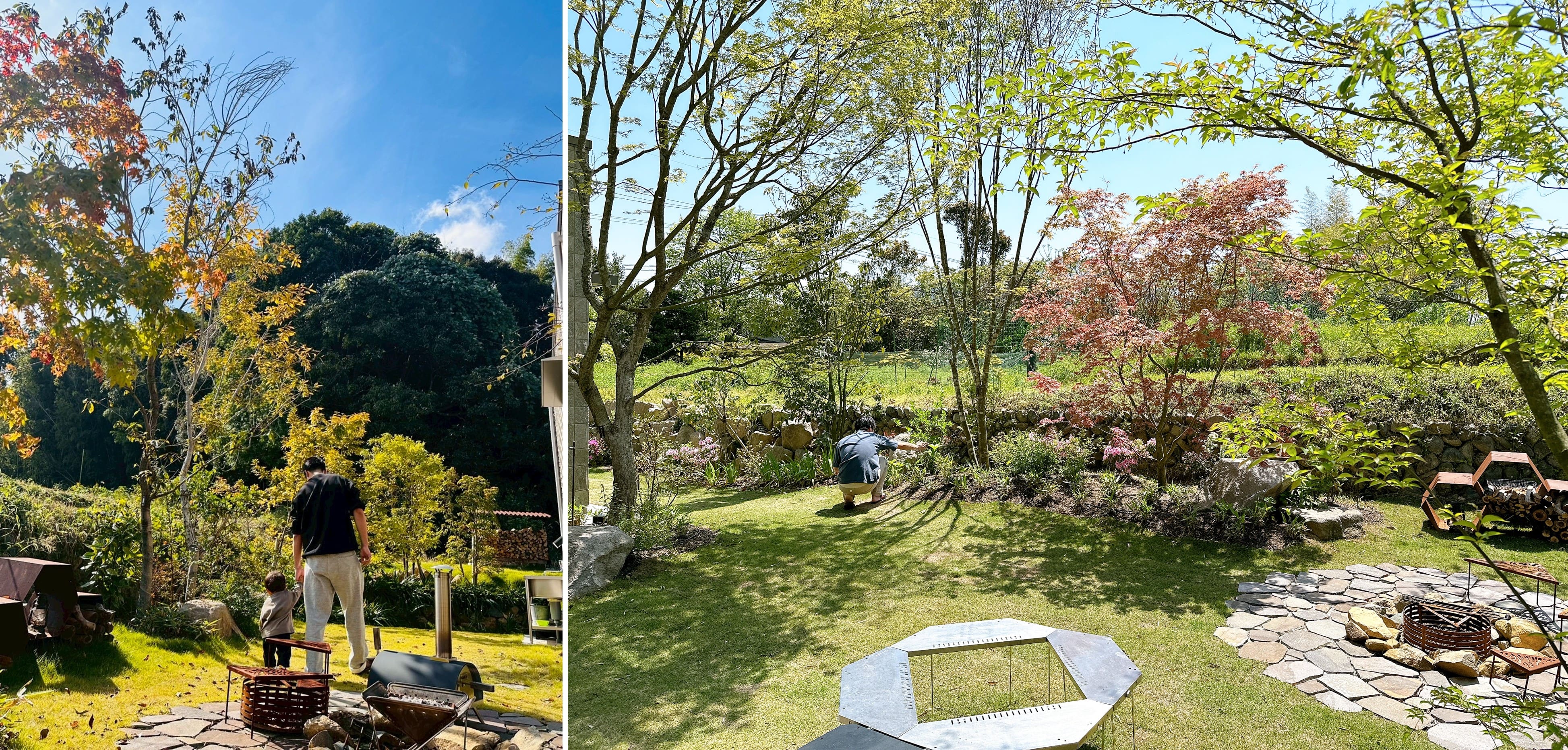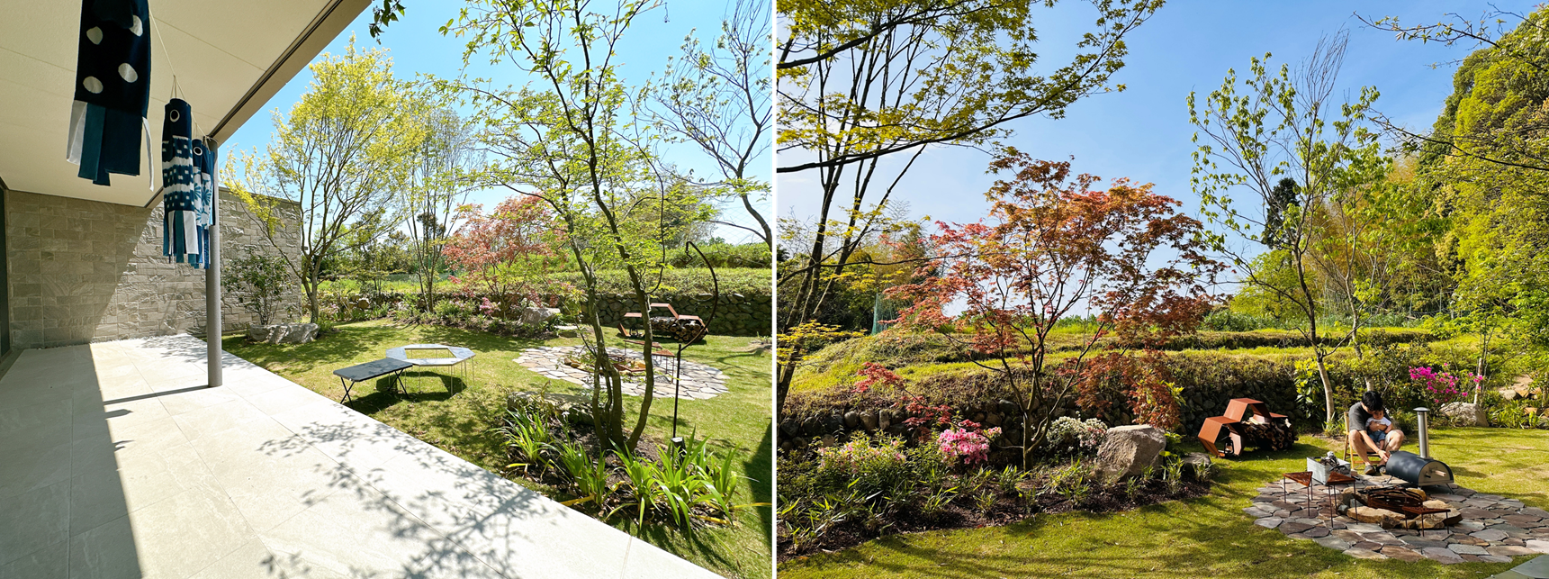 リビングから見たお庭(左)ファイヤーピットでお子様のDくんを抱いてバーベキューの準備をするK様(右)