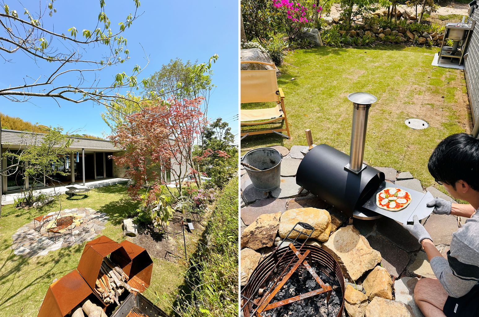 夫のK様がご自身で設置された薪棚(左)ピザを焼くK様(右)