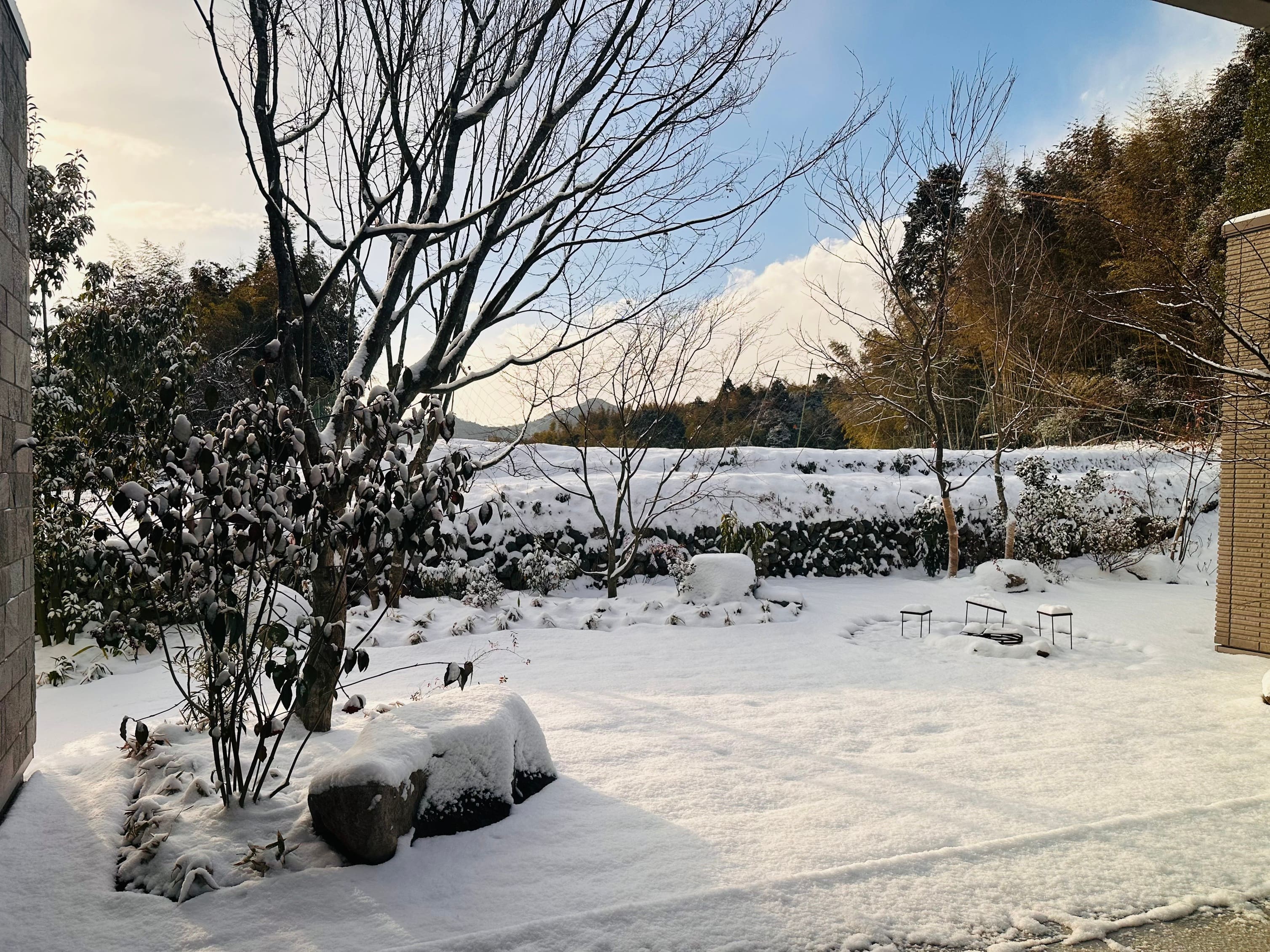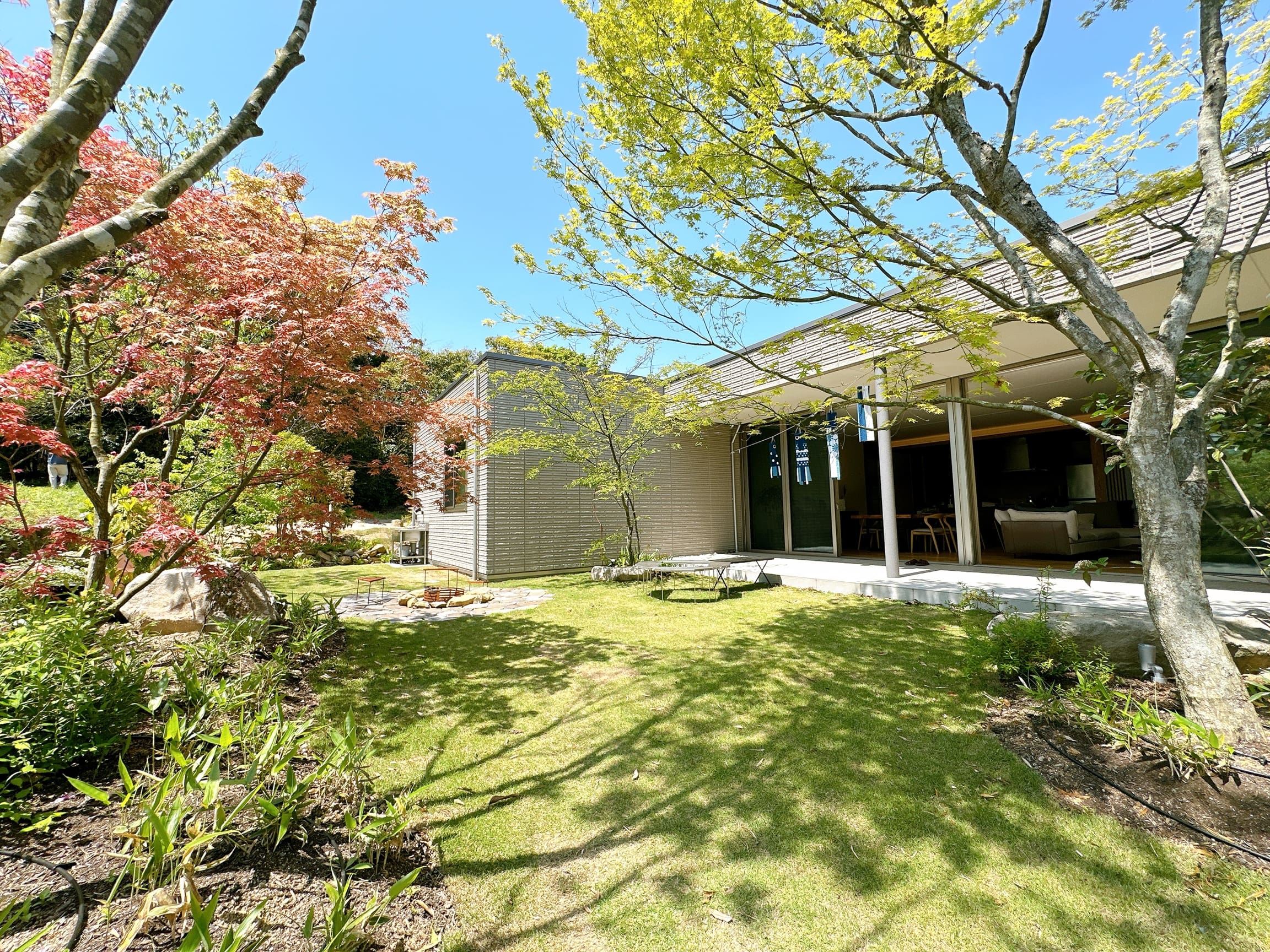 ハンモックがかけられるように、植栽した左手前のアオダモと、右幹の太いヤマモミジ
