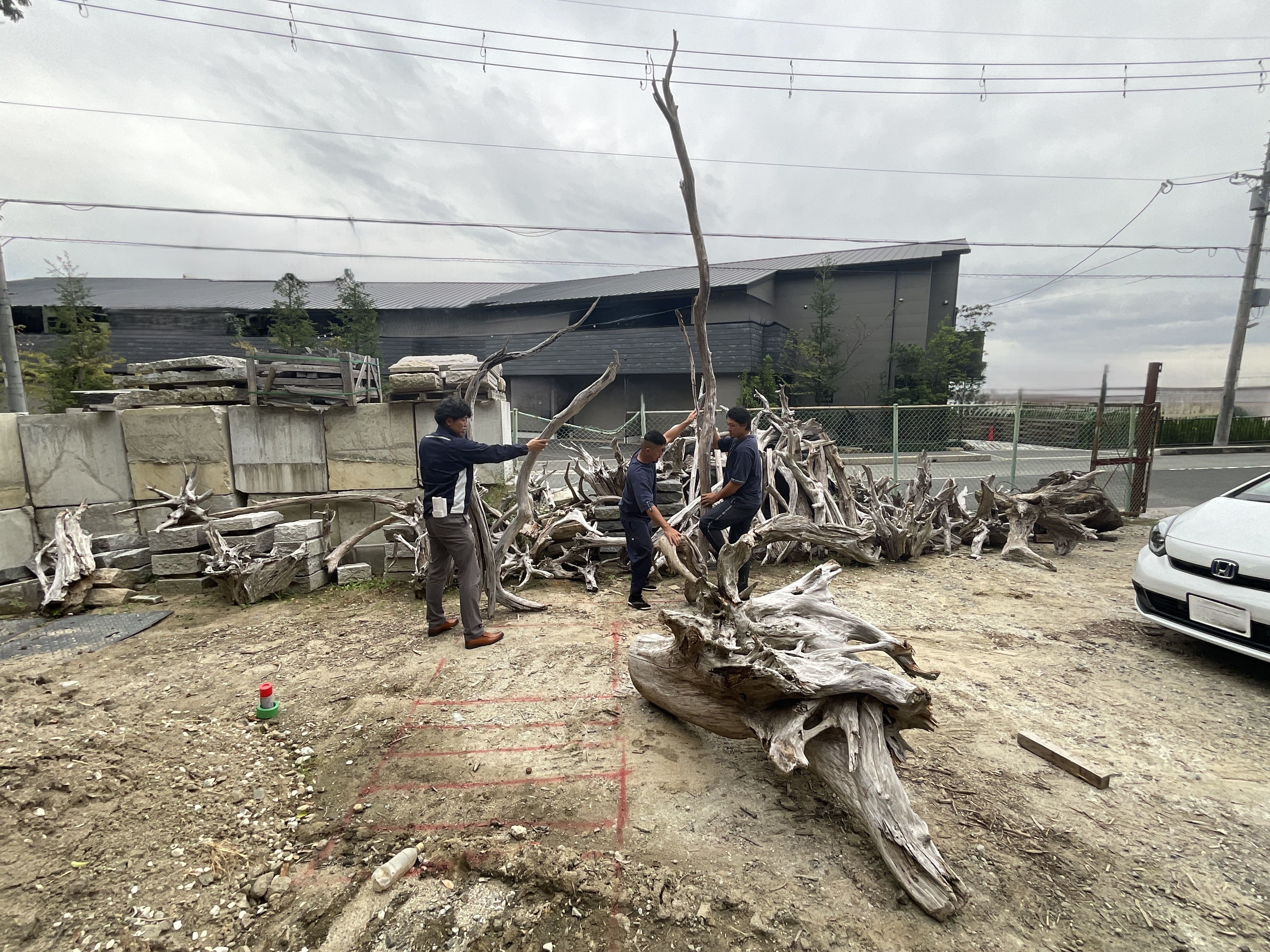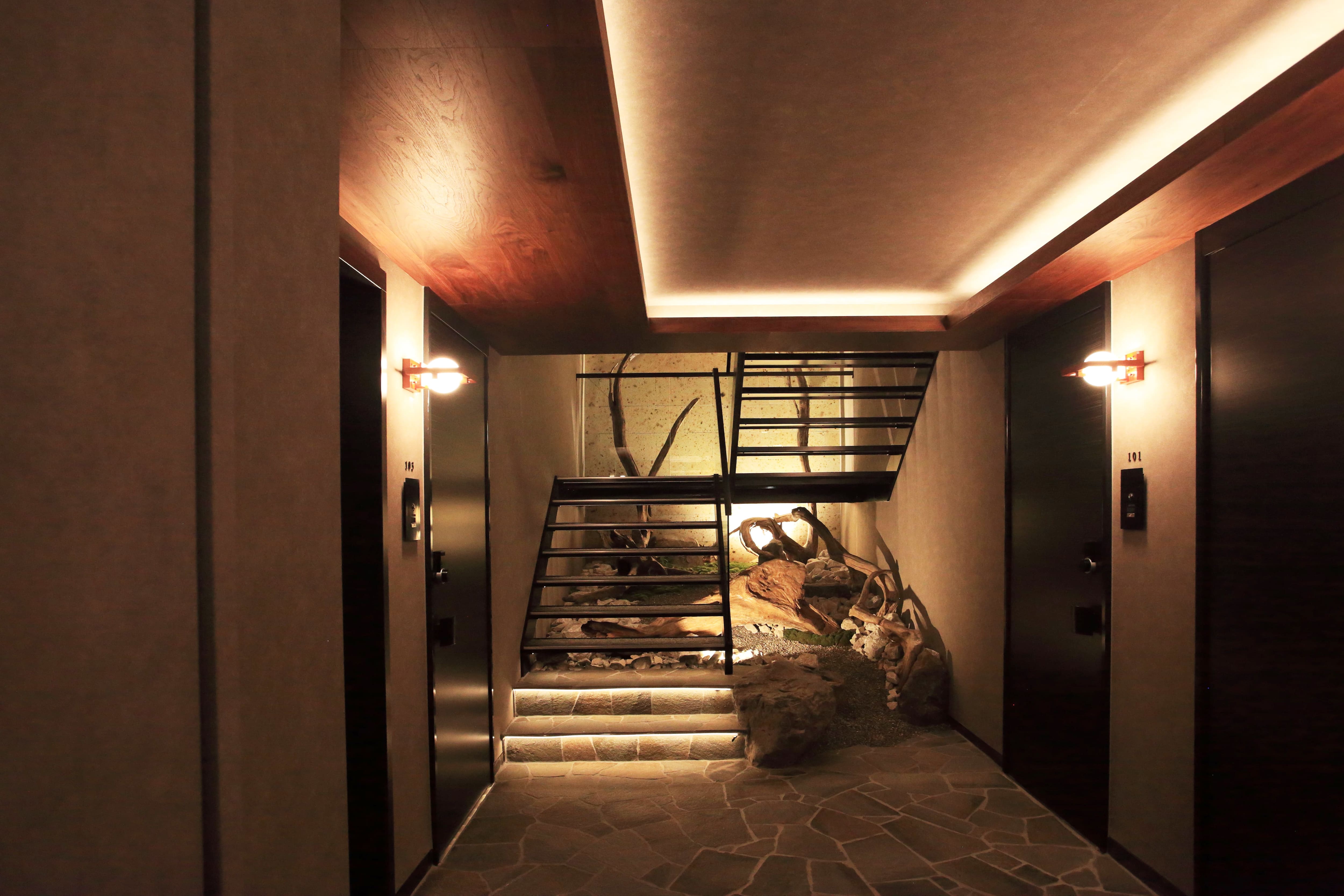 “エイジング”と“自然素材”をキーワードに、床材には外から内へと続く「鉄平石」を選択。さらに、素材としての石を強調するため「景石」を使用。限られた奥行きには一見不釣り合いとも思える石を使うことで迫力を出しました。また、屋外では珍しい流木を防腐剤で処理し採用。流木のサイズにもこだわり、大きなものを共用部にも配置することで、建物全体に統一感をもたらしました。
