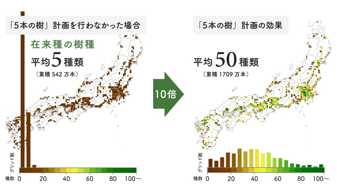 「5本の樹」計画は、生物多様性の基盤となる樹の種類を10倍に