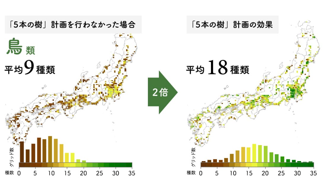 「5本の樹」計画により住宅地に約2倍の種類の鳥を呼び込む効果