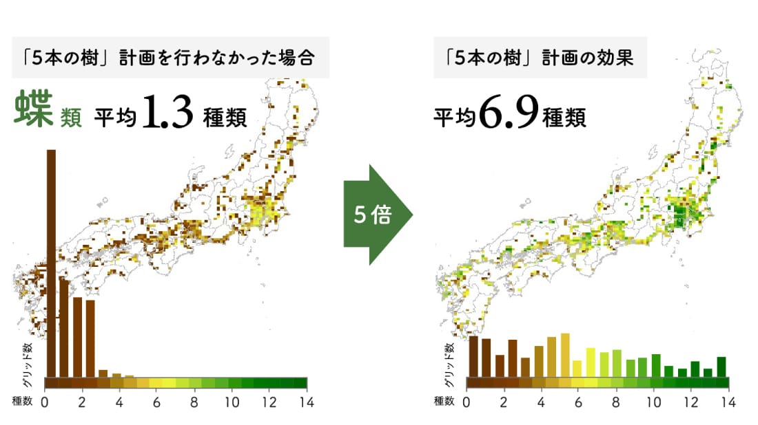 「5本の樹」計画により住宅地に約5倍の種類の蝶を呼び込む効果