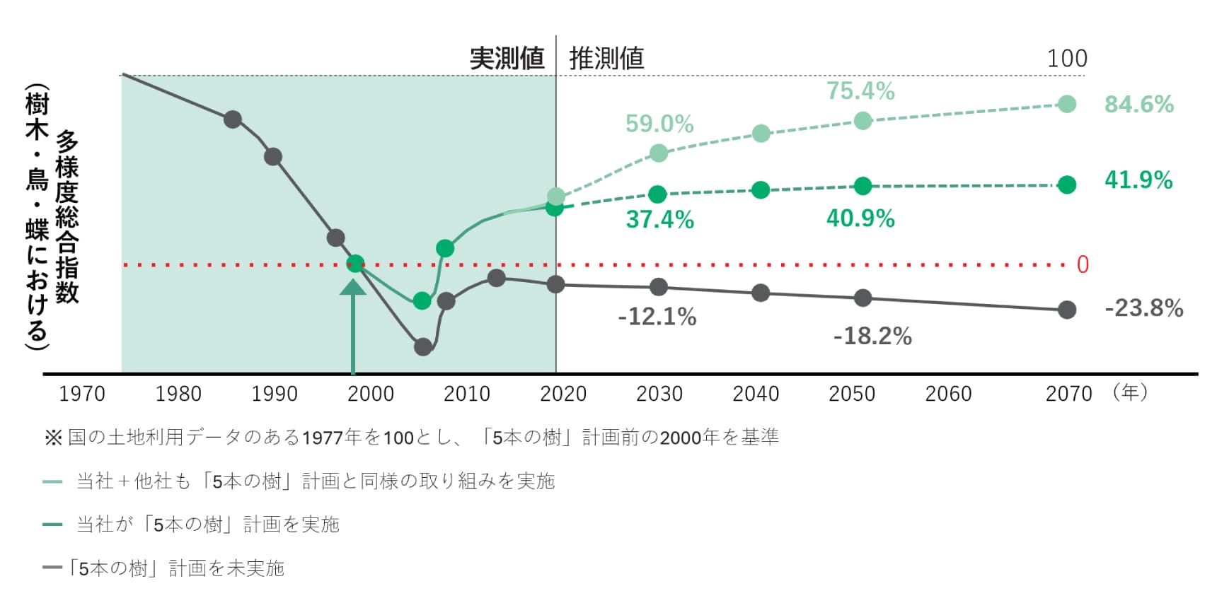 さらに、三大都市圏(関東・近畿・中京)における生物多様性の回復効果を多様度統合指数として定量的に実効性を評価するとともに、「5本の樹」計画を継続した場合の2070年までのシミュレーションを行いました*4。これにより、「5本の樹」計画が生物多様性の回復に貢献できること、今後計画を拡大することでさらに効果が大きくなることが分かりました。当社は、この検証結果だけでなく、20年間の活動を通じて蓄積したノウハウも広く開示し、多くの企業や個人の方々とともにネイチャー・ポジティブに取り組んでいきます。