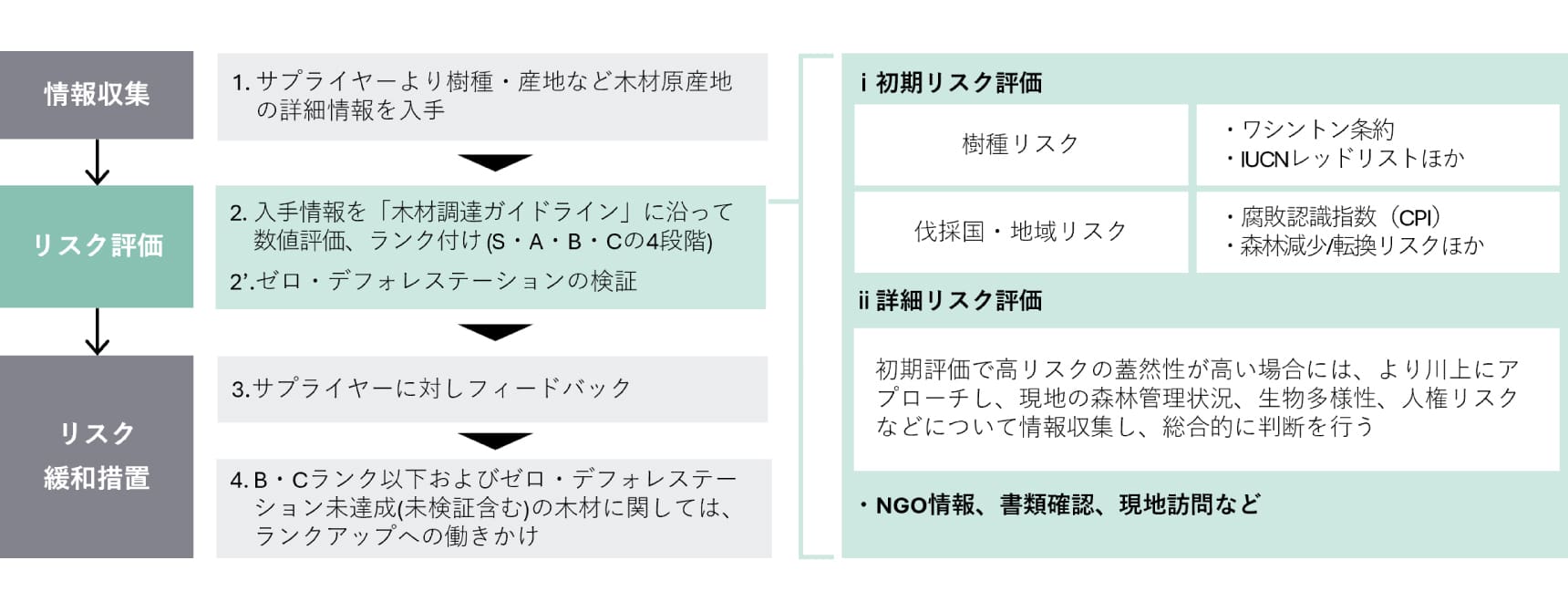 合法であることはもちろん、持続可能性や地域の発展に貢献する木材を「フェアウッド」と定義しています。当社は、木材調達方針において「フェアウッド」調達を優先することを宣言しており、FoE Japanをはじめとした国際環境NGOや業界関係者とのエンゲージメントを通して、調達レベルの向上を図っています。例えば環境NGOとは、高リスク地域の最新情報を入手しリスク評価方法をアップデートするなどの活動を常に行っています。