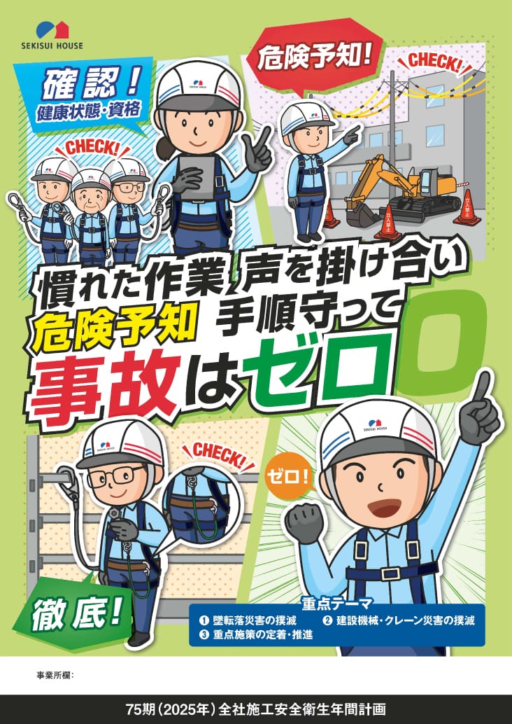 前年度の施工現場の災害発生状況の振り返りから、2025年度は「墜転落災害の撲滅」「建設機械・クレーン災害の撲滅」「重点施策の定着・推進」を重点テーマとして定め、全社共通の年間計画を作成しました。安全活動の基本事項の徹底と実践を継続し、実効性のある対策を定着させることにより、安全・安心な施工現場実現に取り組みました。