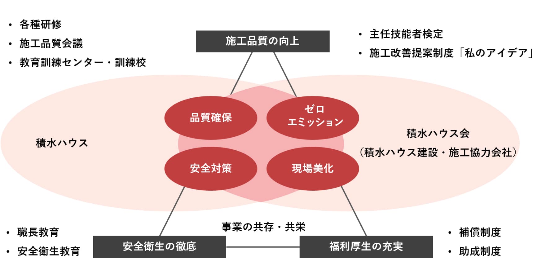 当社グループの最大の強みが、施工に携わるグループ会社や施工協力会社によって構成される「積水ハウス会」の存在です。創業当初から「責任施工」を実践してきた当社にとって、施工協力会社の存在はかけがえのないものであり、「運命協同体」として長きにわたり信頼関係を育み、常にその絆を大切にしてきました。「積水ハウス会」では、お客様満足を実現するために当社の各事業所と連携し、安全対策や品質向上はもとより、お客様や近隣の皆様への対応、ゼロエミッション活動、現場美化、人財の育成、労働環境の整備など、さまざまな取り組みを進めています。