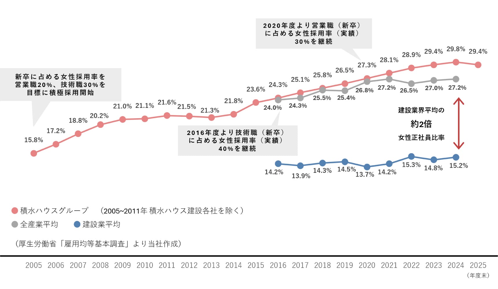 多様な価値観や視点が求められる住まいづくりにおいて、「当社グループの事業活動におけるあらゆる分野で女性の活躍は重要である」との考えのもと、経営の重要課題として女性の活躍推進に取り組んでいます。建設業界では、他の産業に比べ女性従業員比率が低い状況です。男性主導や重労働を伴う業務、キャリアパスの欠如や職場環境の課題などがその要因とされていました。当社グループではこれらの課題に真摯に向き合い、2005年以降、女性の積極的採用、営業職や技術職など職種別の育成と定着に向けたキャリアアップ支援や環境整備、管理職候補者の育成や登用に取り組むとともに、あらゆるライフステージで女性が活躍できるよう、より包括的な職場環境の整備や企業文化の醸成を実施しています。2025年度末時点で女性正社員の割合は29.4%となり、建設業界平均(15.2%)の約2倍の比率の女性が正社員として活躍しています。