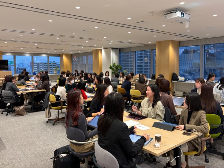 また、事業所の枠を超えたネットワーク構築の機会として、2007年から「全国女性営業交流会」を毎年開催しています。この交流会では、全国の女性営業職が一堂に会し、業績表彰や経営トップによる講話をはじめ、年次別に優績者による事例発表、多様なロールモデルとの交流やグループ討議などにより、各自のスキルアップやキャリア形成、モチベーション向上に寄与しています。この交流会は、2024年度は東西2会場にて対面開催、2025年度は6年ぶりに全国一堂に集う単独会場での対面開催にて実施し、女性営業職の所属店長もオンラインで参加しています。