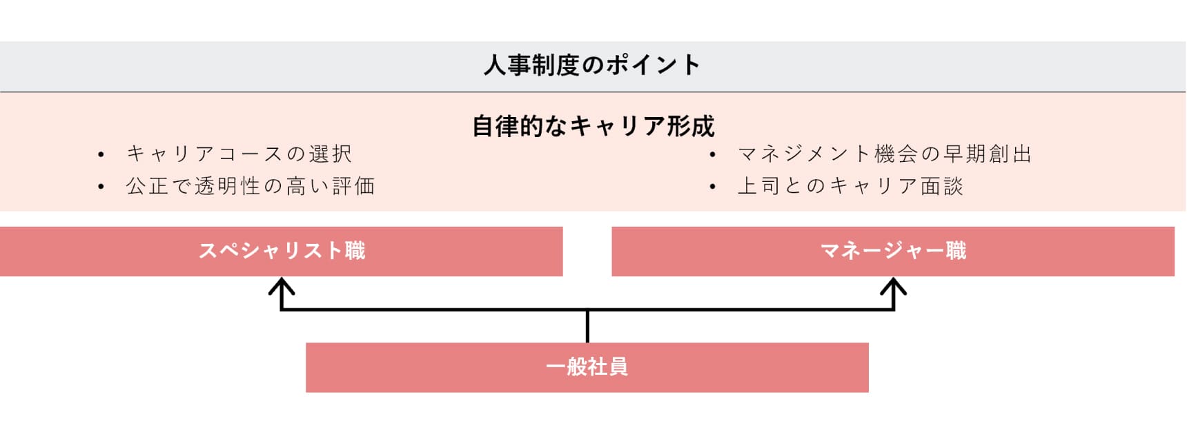 管理職には、マネジメント力を発揮する「マネージャー職」と、高度な専門性を発揮する「スペシャリスト職」を設置し、自身のキャリアコースを自らが選択し、実現できる人事制度を導入しています。
