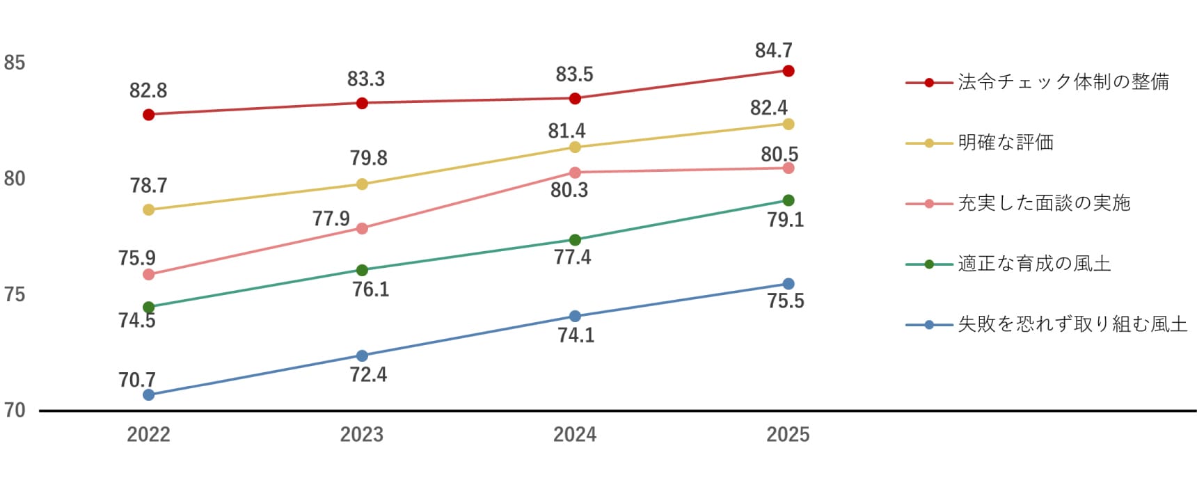 ガバナンス意識調査の「人財育成」においては、面談や評価、育成風土に関する項目で測定しています。2022年から経年で各ポイントが上昇しており、公正な評価制度が着実に機能していることが表れています。一方で、失敗を恐れずに取り組む風土は全項目のうち低い傾向にあるため、法令遵守のガバナンス意識の良さを残しつつ向上することが課題と考えています。