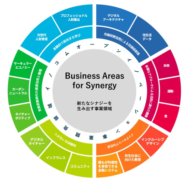 積水ハウスグループでは、2024年2月に「積水ハウス イノベーション&コミュニケーション株式会社」を設立しました。イノベーション人財やグローバル人財の育成に加え、社外パートナーとのオープンイノベーションを通じて、社会に新たな価値を創造し、人々の生活をより豊かに、より幸せにすることを目指しています。事業創出においては、”Business Areas for Synergy(新たなシナジーを生み出す事業領域)”のコンセプトに基づきオープンイノベーションを推進することで、協業先とお互いの事業成長や人財価値の向上に寄与しながら、「住まいと暮らし」に関する様々な社会課題解決を目指します。