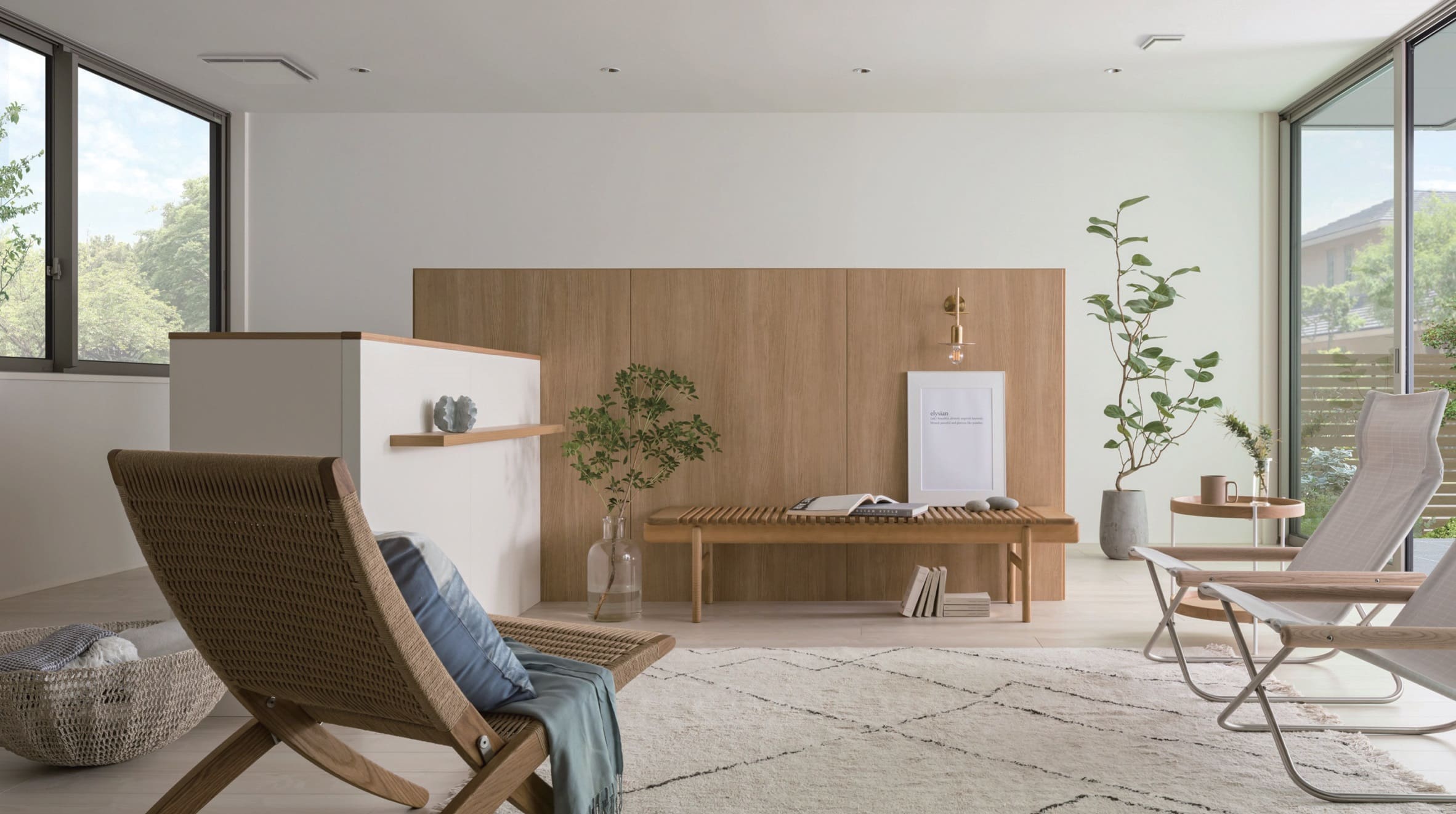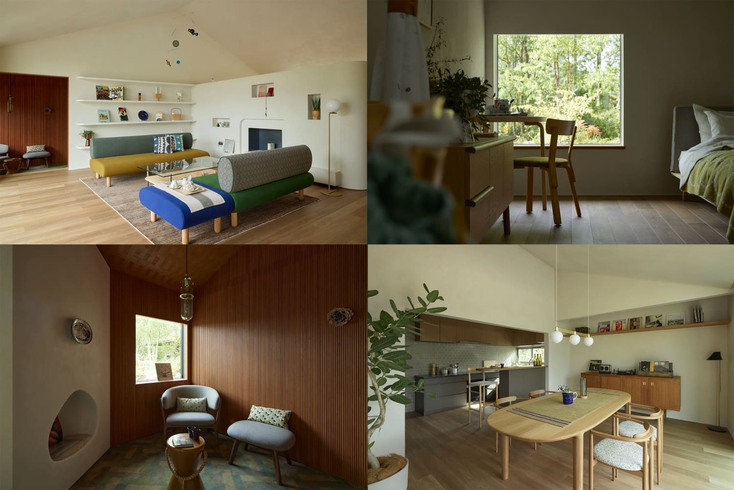 Tomorrow's life museum山口に内に建てたモデル棟です。minä perhonen(ミナ ペルホネン)の ファウンダー/デザイナーの皆川明氏とのコラボモデルとなっており、life knit designの思想を基に子どもの五感や創造力を刺激し、豊かな心と生きる力を育む住まいを提案しています。平屋の良さを活かした自然に近い暮らしを実現し、大空間を緩やかに仕切り、家族が互いに気配を感じられる居どころを計画しました。家族と団欒したり、家族に見守られながら工作やモノづくりを楽しんだり、立体的な子ども室を走り回ったり、多彩な居どころは様々な気持ちの変化を受け止めてくれる空間となっています。風景に調和するインテリアに、アートや日々の暮らしの想い出が空間を彩っていく。カーテンや間仕切家具で緩やかに仕切ったひとつながりの空間は、将来の家族の成長や変化を許容し、さまざまな使い方のできる可能性をもち、子供の感性や成長を考え計画しています。