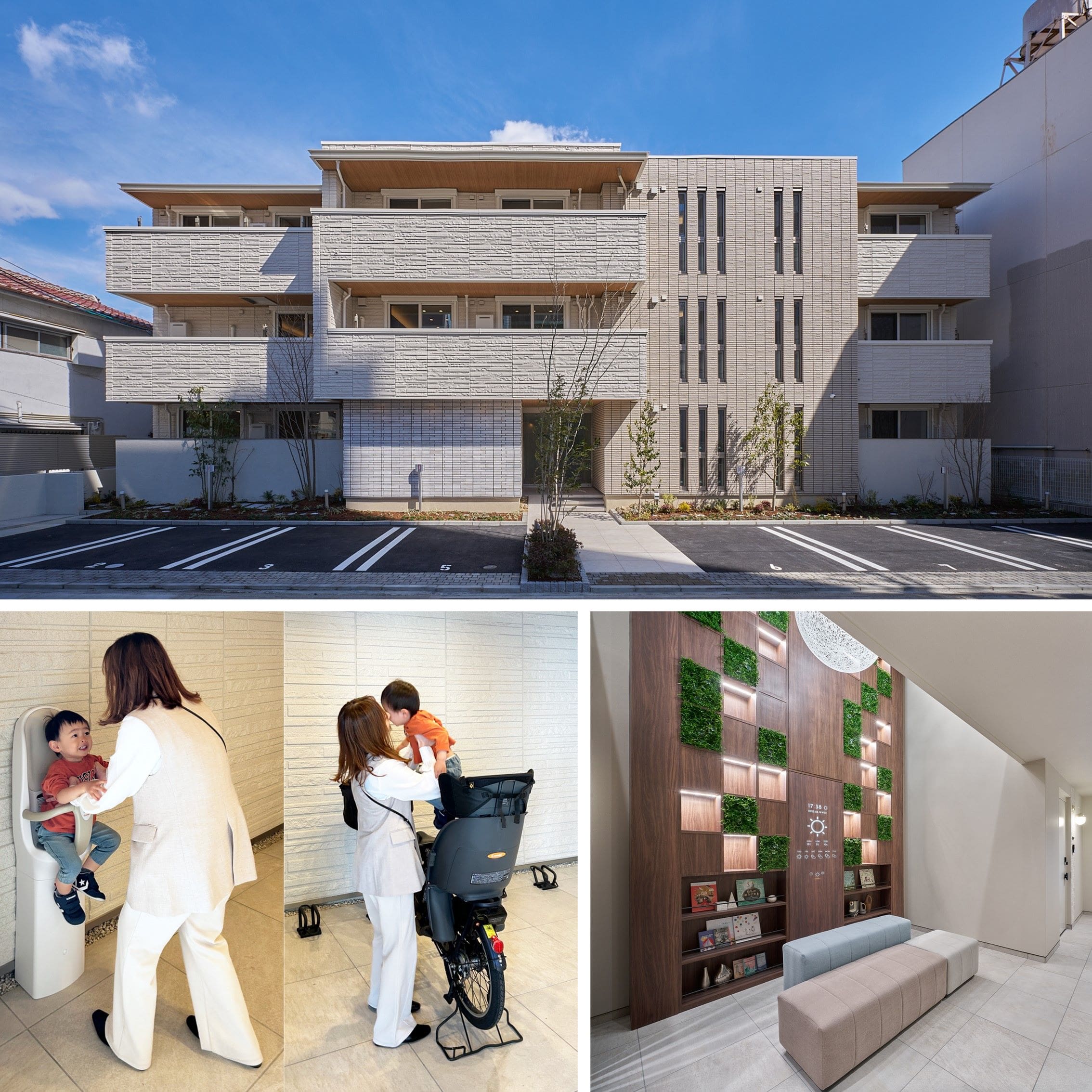 親子でのおでかけを安全・スムーズに・楽しくするための集合賃貸住宅のエントランス提案です。都市部での外出に不可欠な子乗せ自転車をより安心して使えるよう、駐輪場の新しい仕掛けとして「ベビーキープ」を採用し、使いやすくゆとりのある設計寸法で計画しました。共用部や専用部にも様々なお出かけしやすい仕掛けを備えています。