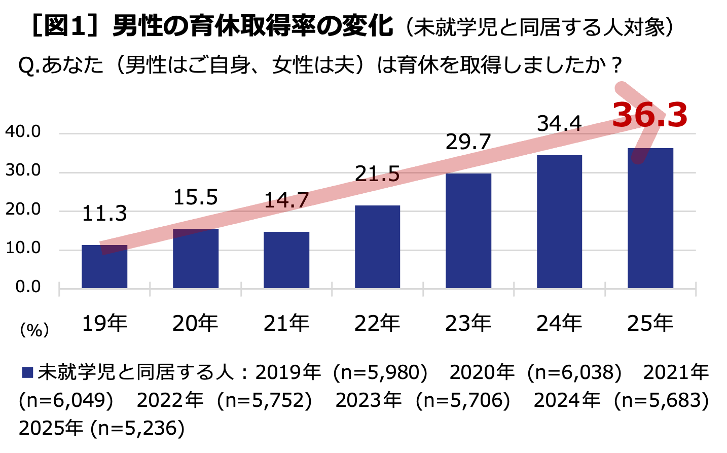 未就学児の子がいる男性の育休取得率は36.3%とおよそ3人に1人が取得。若いパパ・ママ層では男性の育休取得が定着し、取得率は急速に高まっている。