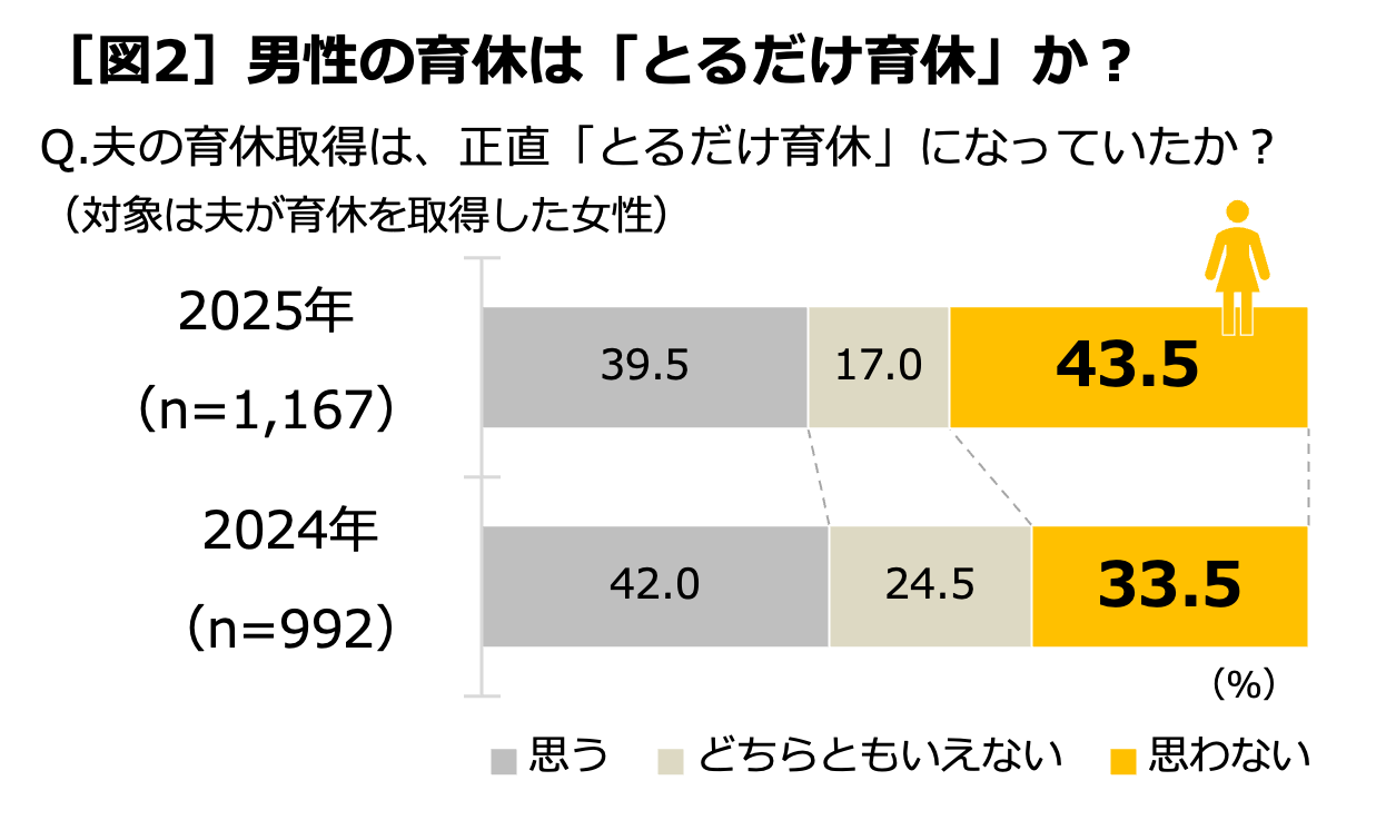 夫が育休を取得した女性に、夫の育休が「とるだけ育休」になっていたかを聞くと、「とるだけ育休だと思わない」(43.5%)が昨年(33.5%)より10ポイント高くなっています[図2]。