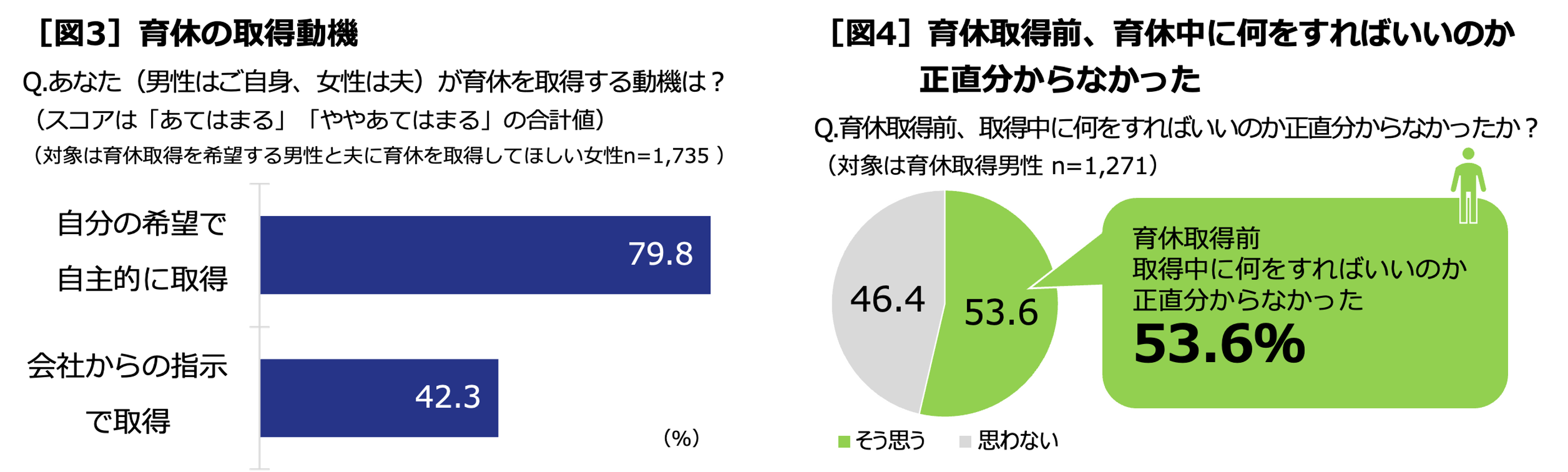また、育休取得を希望する男女に取得動機を聞くと、「会社からの指示で取得」(42.3%)より「自分の希望で自主的に取得」(79.8%)が多くなっています[図3]。外的要因ではなく、育児を自分ごと化したいという、育児に積極的な人が多くなったようです。一方で、育休取得男性の半数が「育休取得前、取得中に何をすればいいのか正直分からなかった」(53.6%)と答えています[図4]。