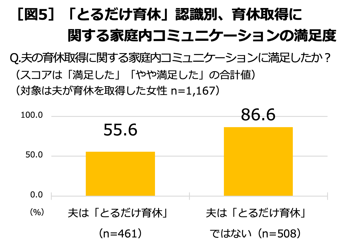 よりよい育休にするためにはどうすればよいのか? 男性育休に関する、女性(妻)の家庭内コミュニケーションの満足度を比較しました。夫が「とるだけ育休」の女性の家庭内コミュニケーションの満足度は55.6%なのに対し、夫が「とるだけ育休」ではない女性は86.6%と満足度が30.9ポイント高いことが分かりました[図5]