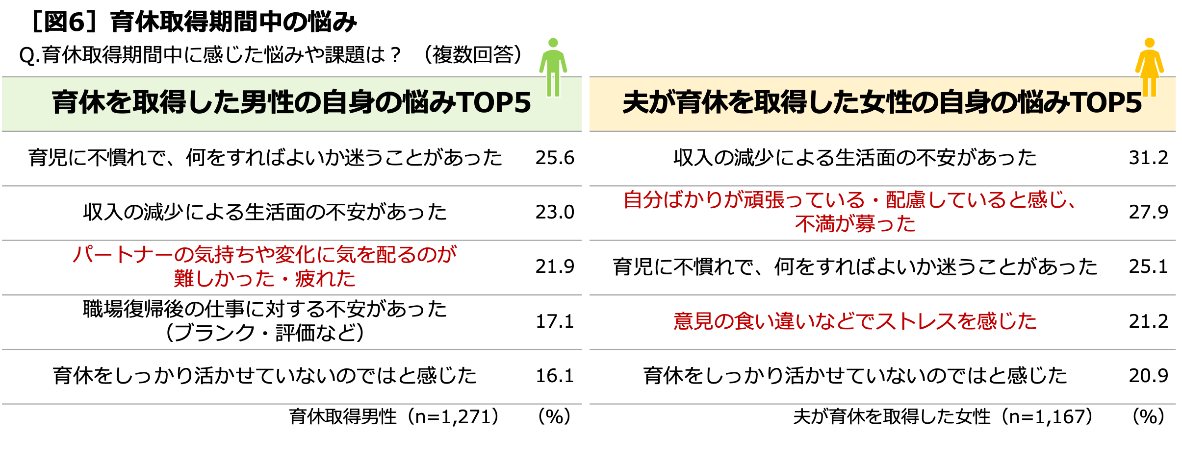 実際に育休取得期間中に感じた悩みを聞くと、男女ともに収入面の心配が上位に入ったものの、男性は「パートナーの気持ちや変化に気を配るのが難しかった・疲れた」(21.9%)、女性は「自分ばかりが頑張っている・配慮していると感じ、不満が募った」(27.9%)、「意見の食い違いなどでストレスを感じた」(21.2%)が上位に挙げられました[図6]。夫婦のコミュニケーションで解決できそうな悩みが多いことが分かります。