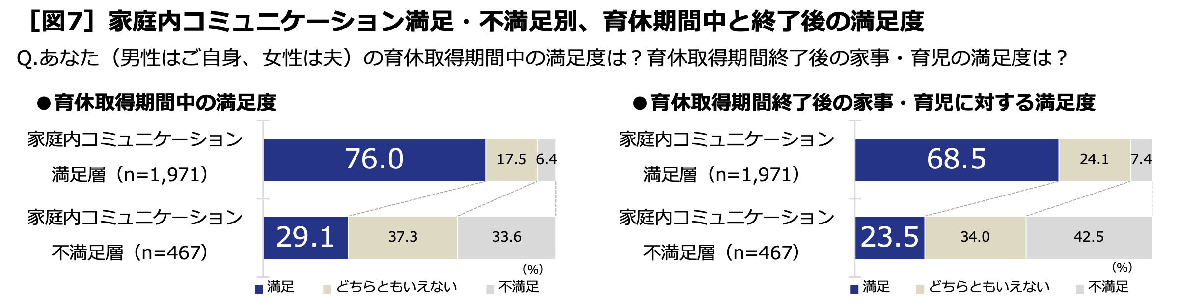 次に、家庭内コミュニケーションの満足度別に育休取得の満足度を見ると、家庭内コミュニケーションに「満足」と答えた人(満足層)は育休取得期間中の満足度が76.0%と高いのに対し、「不満足」と答えた人(不満足層)は29.1%と低く、46.9ポイントの差が生じています。育休取得期間終了後の満足度も同様の傾向で、家庭内コミュニケーションに「満足」と答えた人は68.5%、「不満足」と答えた人は23.5%と、こちらも45.0ポイントもの差があります[図7]。家庭内でのコミュニケーションの充実度が、家事・育児の満足度に影響する傾向にあることが分かりました。