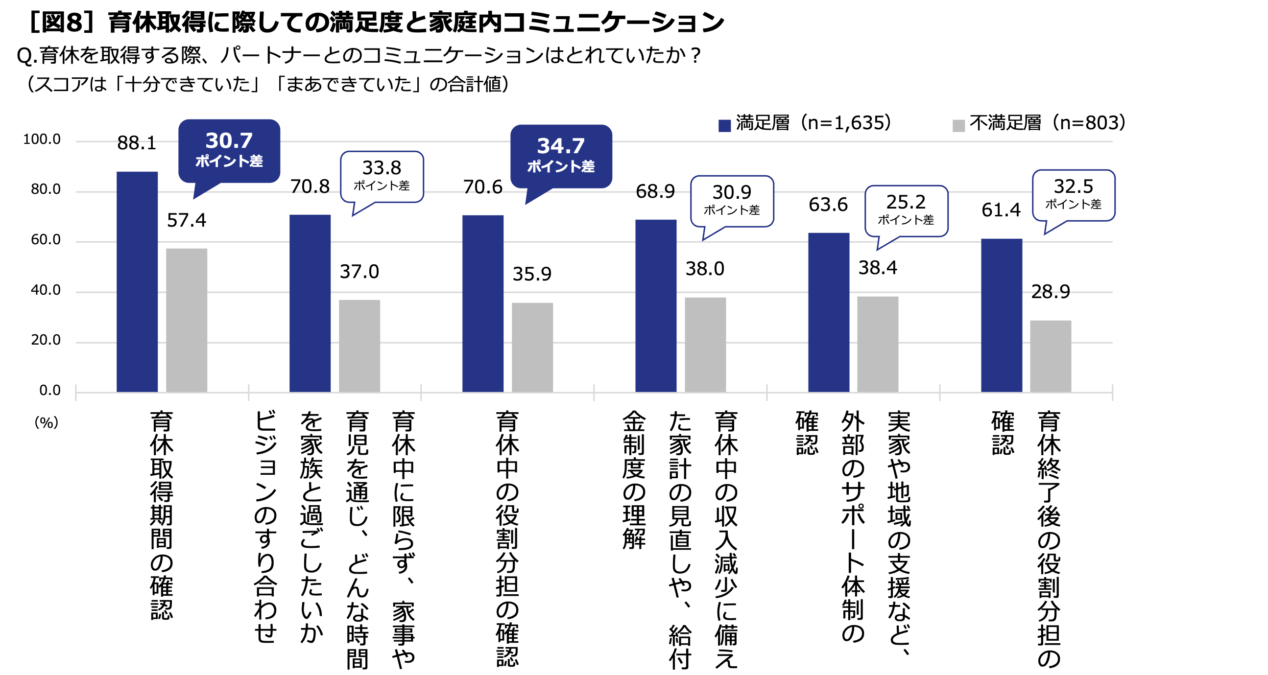 「育休取得期間の確認」について聞くと、満足層は88.1%が確認の会話をしているのに対し、不満足層は57.4%にとどまり、30.7ポイントの差があります。「育休中の役割分担の確認」も、満足層は70.6%が分担について話し合っているのに対し、不満足層は35.9%と低く、こちらも34.7ポイントの差が生じており、不満足層はパートナーとのコミュニケーションがとれていない様子がうかがえます[図8]。