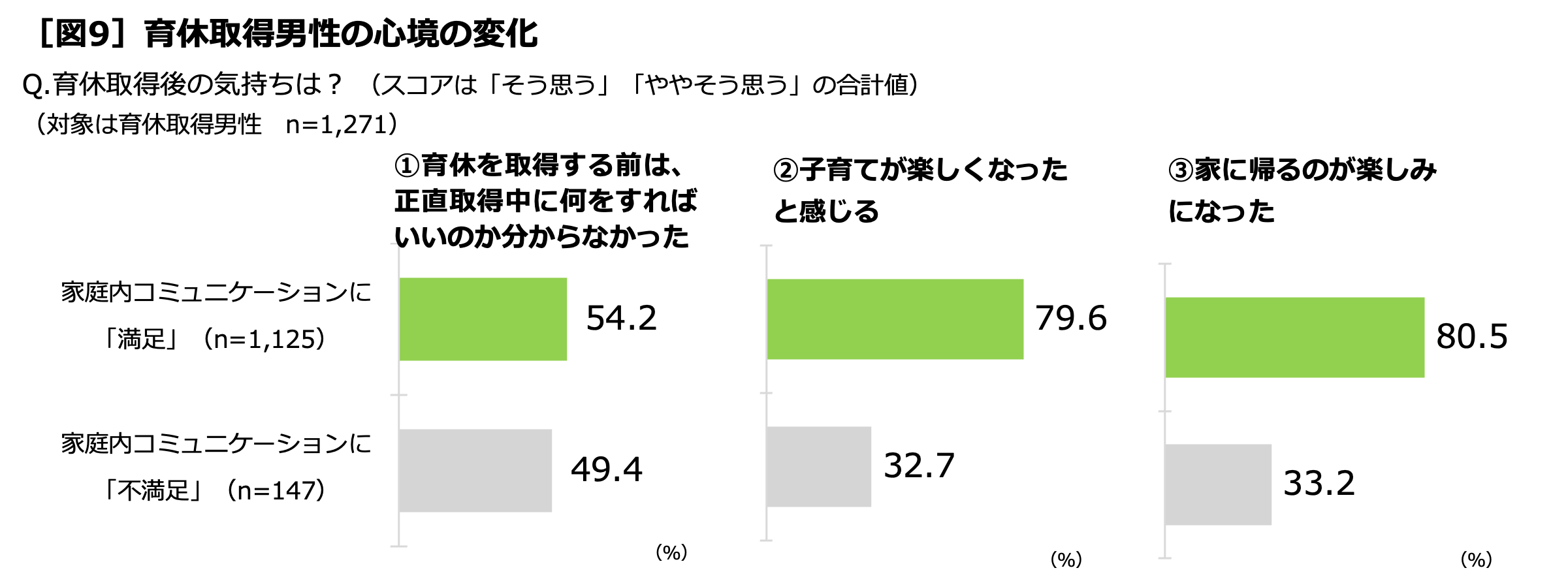 「手探り育休」の人でも、家庭内コミュニケーションの満足度によって、育休取得後の心境にポジティブな変化があらわれることが分かりました。そこで、家庭内コミュニケーションの満足度別に、育休取得男性の取得後の変化を比較してみたところ、育休取得前はどちらも約半数が「①何をすればいいのか分からなかった」と感じていますが、家庭内コミュニケーションに「満足」している男性は、育休取得後に約8割が「②子育てが楽しくなったと感じる」(79.6%)、「③家に帰るのが楽しみになった」(80.5%)と答えています。一方、「不満足」の男性はどちらも3割台と低く、家事・育児を楽しめていない傾向が見られました[図9]。