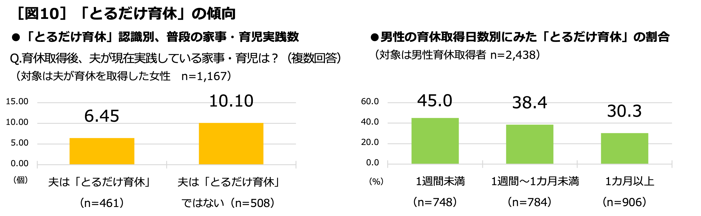 ちなみに、家庭内コミュニケーション以外で、よりよい育休にするためのヒントとしては、家事・育児の実践数、取得日数が関係する傾向にあるようです。「とるだけ育休」認識別で、28種類の家事・育児の中から男性が普段行う実践数を比較すると、「とるだけ育休」ではない夫の家事・育児実践数は平均10.10個なのに対し「とるだけ育休」の夫は平均6.45個と3.65個も少なくなっています。また、育休取得日数別に見ると、取得期間が1週間未満だと45.0%が「とるだけ育休」と見なされますが、1カ月以上の取得だと30.3%と割合が低くなっています[図10]。家事・育児の実践数も育休取得日数も少ないと、「とるだけ育休」と感じる傾向があるようです。