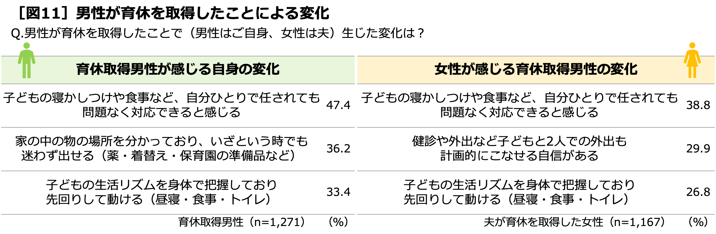 男性育休がもたらす効果として、育休取得男性にも女性からの評価にもポジティブな変化があったようです。取得男性の取得後の変化を取得者本人と女性に聞いたところ、「子どもの寝かしつけや食事など、自分ひとりで任されても問題なく対応できると感じる」が男女とも1位(男性47.4%、女性38.8%)に挙げられ、女性からは夫は「健診や外出など子どもと2人での外出も計画的にこなせる自信がある」(29.9%)、「子どもの生活リズムを身体で把握しており、先回りして動ける」(26.8%)なども評価されています[図11]。