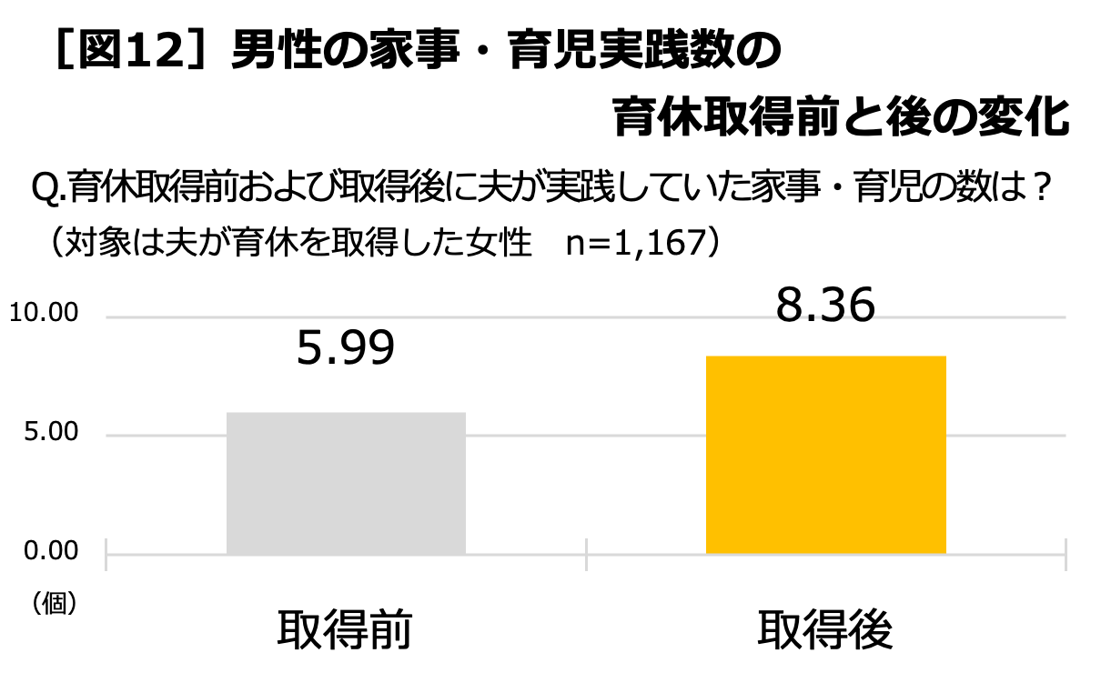 また、育休取得によって、男性の家事・育児実践数も2.37個増えていることが分かりました。育休取得前の家事・育児実践数は平均5.99個ですが、育休取得後は平均8.36個に増え、育休取得後かなり頼りになるパパに成長している様子がうかがえます[図12]。