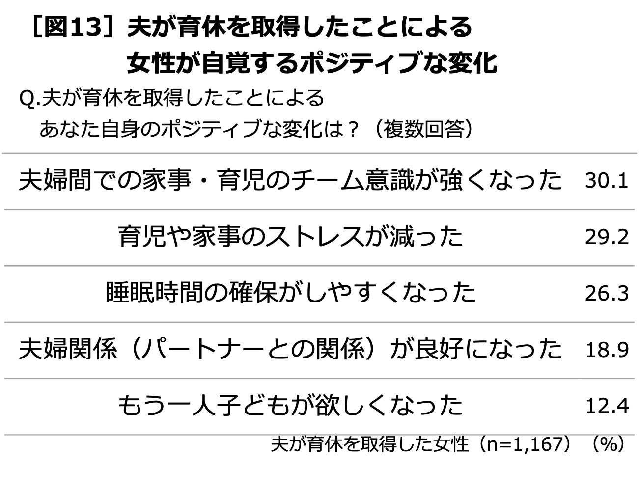 さらに男性の育休取得によって、女性自身にもポジティブな変化があることが分かりました。「夫婦間での家事・育児のチーム意識が強くなった」(30.1%)、「育児や家事のストレスが減った」(29.2%)、「睡眠時間の確保がしやすくなった」(26.3%)が上位に挙げられました[図13]。