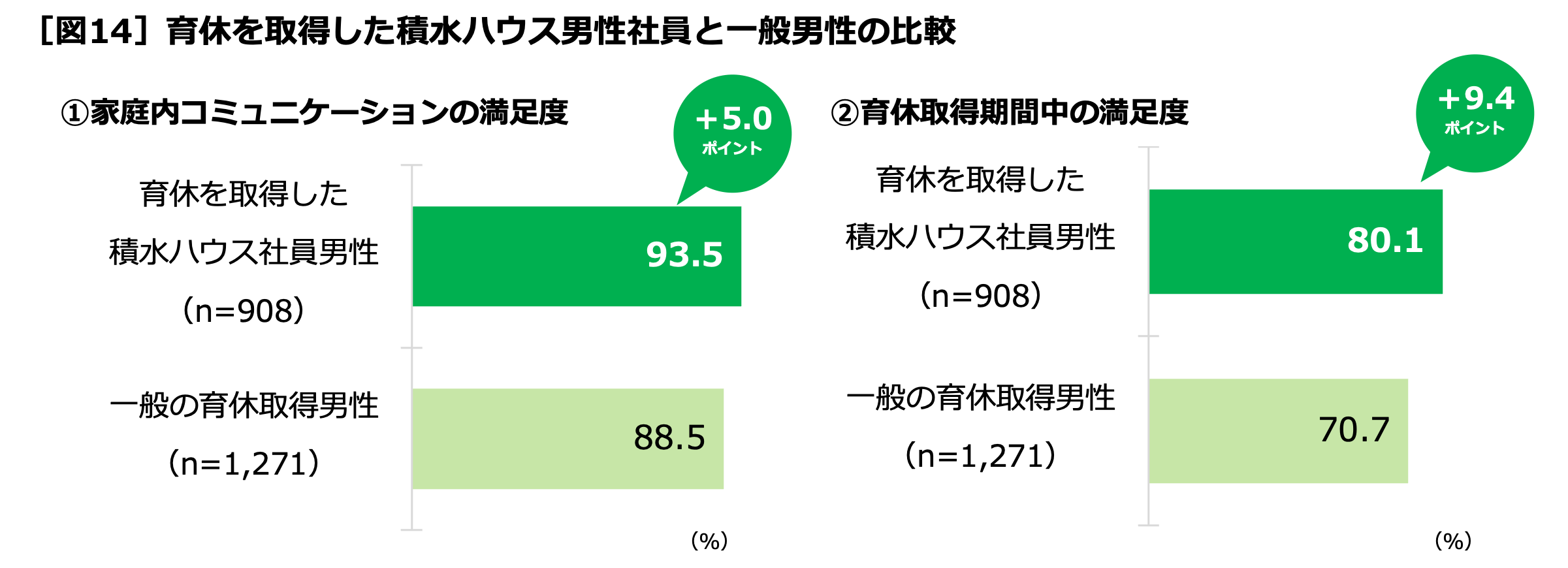 積水ハウスでは、「家族ミーティングシート※」を用いて、夫婦それぞれが育休を取得する目的や取得期間、理想の家事・育児分担を事前に整理する取り組みを行っています。育休を取得した積水ハウス男性社員の家庭内コミュニケーションの満足度は93.5%(一般の育休取得男性比+5.0ポイント)、育休取得期間中の満足度は80.1%(同+9.4ポイント)でした[図14]。育休取得前から活用する「家族ミーティングシート」の運用などが、効果を発揮していることがうかがえます。