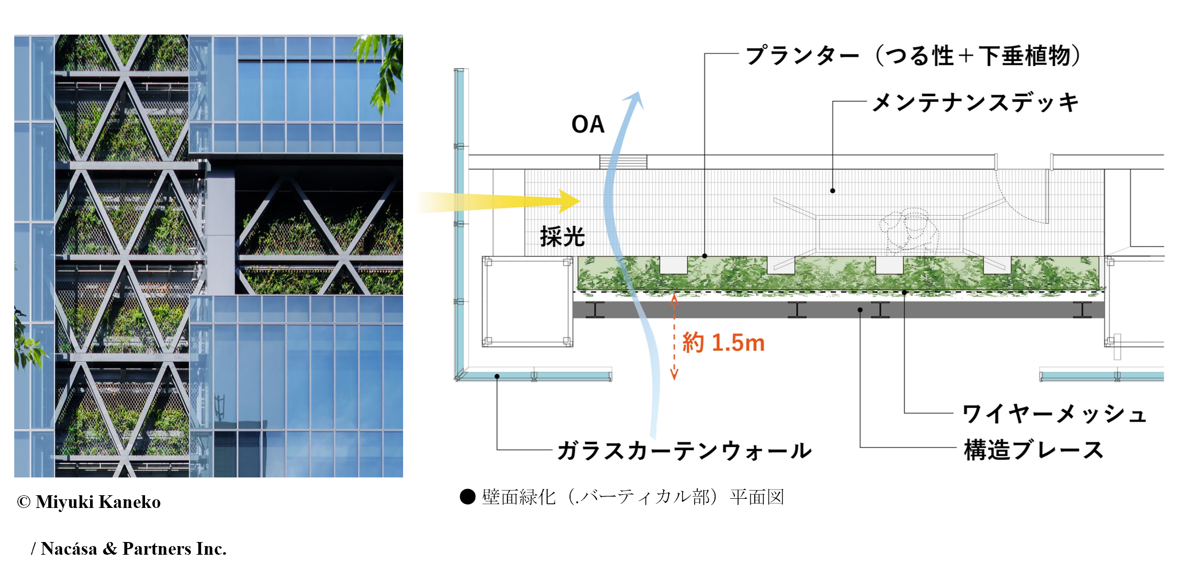 輻射熱抑制と多様な植栽構成の壁面緑化を有する緑化施設を備えています。高さ150mまで