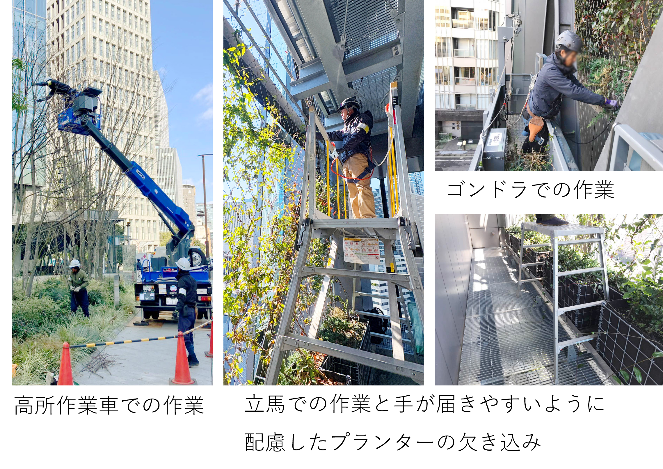 地上部においては、大樹の剪定などを容易に行えるよう、高所作業車の乗り入れを予め想定し、広場や緑道の舗装については必要な幅員と強度を確保しています。壁面緑化については、通常のメンテナンスは内側のメンテナンスデッキに立馬を設置して作業を行い、スポットでの補助的なメンテナンスにはゴンドラを使用し外側から対応するという管理手法を採用しています。