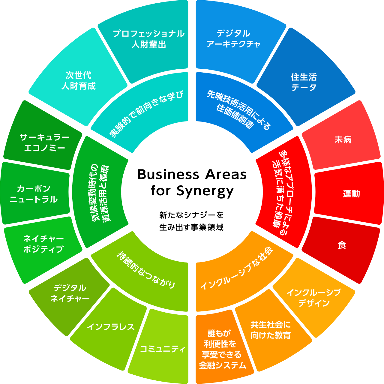 積水ハウスグループでは、2024年2月に「積水ハウス イノベーション&コミュニケーション株式会社」を設立しました。イノベーション人財やグローバル人財の育成に加え、社外パートナーとのオープンイノベーションを通じて、社会に新たな価値を創造し、人々の生活をより豊かに、より幸せにすることを目指しています。事業創出においては、”Business Areas for Synergy(新たなシナジーを生み出す事業領域)”のコンセプトに基づきオープンイノベーションを推進することで、協業先とお互いの事業成長や人財価値の向上に寄与しながら、「住まいと暮らし」に関する様々な社会課題解決を目指します。