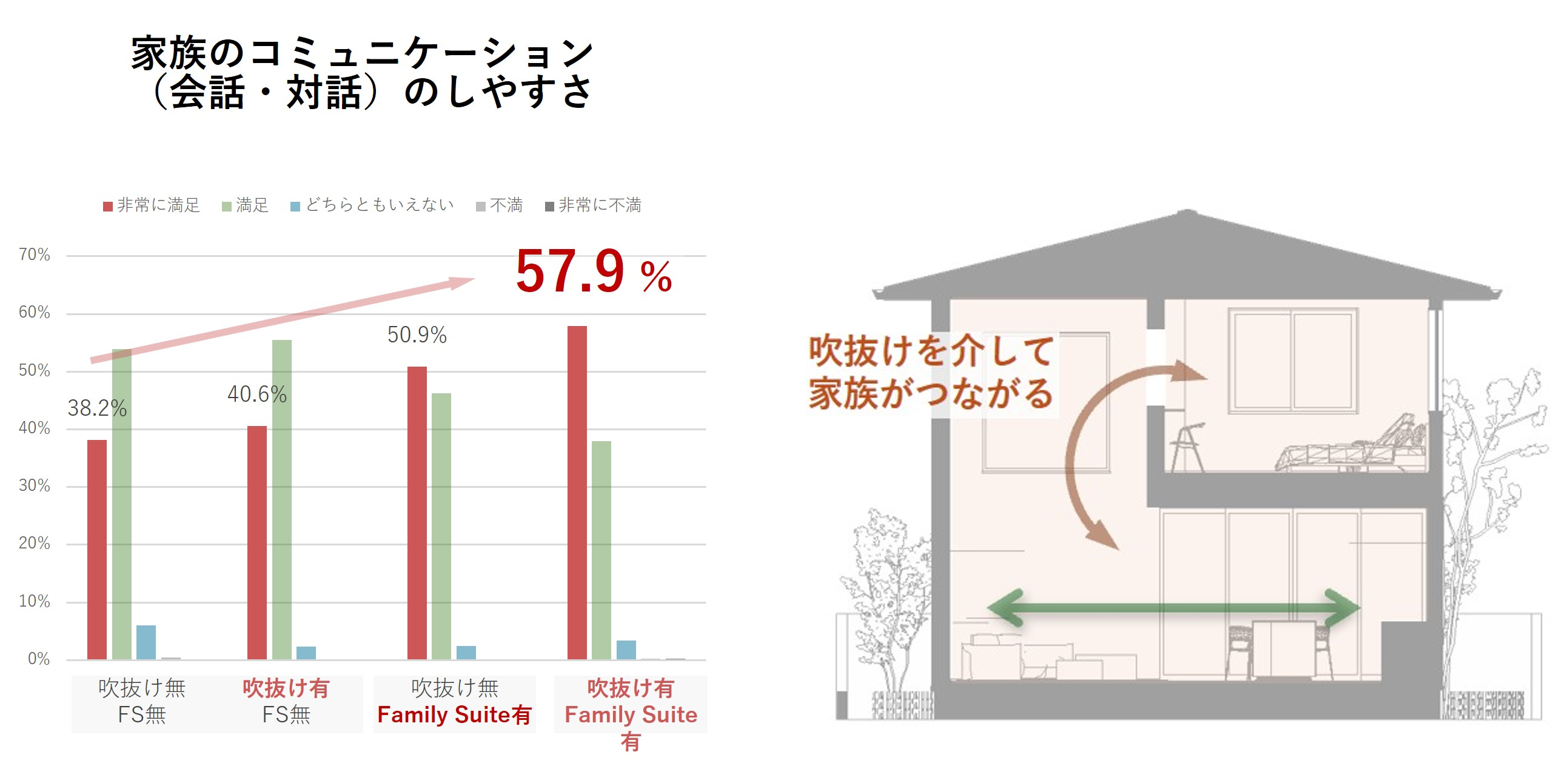 当社の研究機関である総合住宅研究所の調査によると、吹き抜けを備えた住まいでは、家全体で家族の気配を感じることができ、家族のコミュニケーションのしやすさが大きく向上することが確認されています。