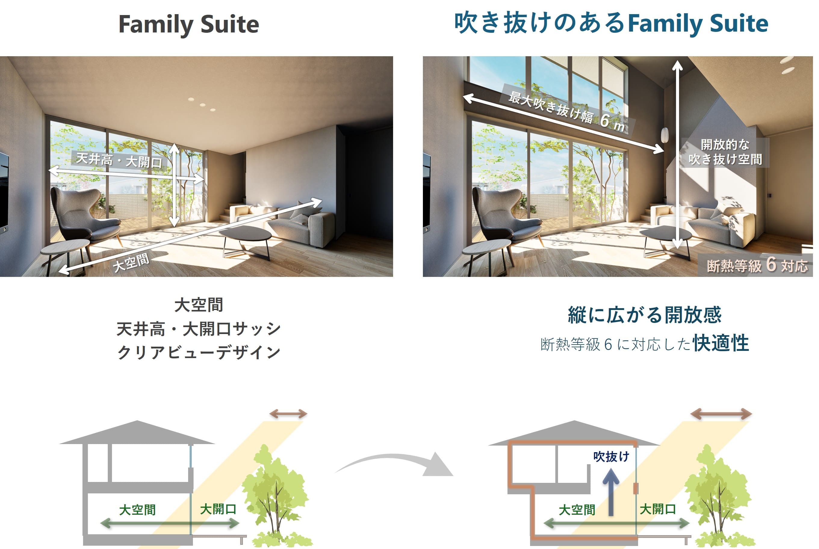 吹き抜け・大開口・断熱等級6を同時に叶える「ファミリー スイート」を提供