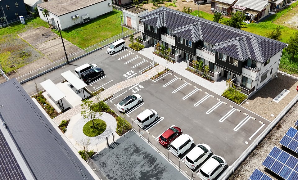 - ・入居者の快適な生活と経済的負担の軽減を考慮して、建物はZEH仕様とした。各戸に接続された太陽光発電システムを入居者が利用でき、発電した余剰電力は売電できるようになっている。
